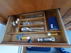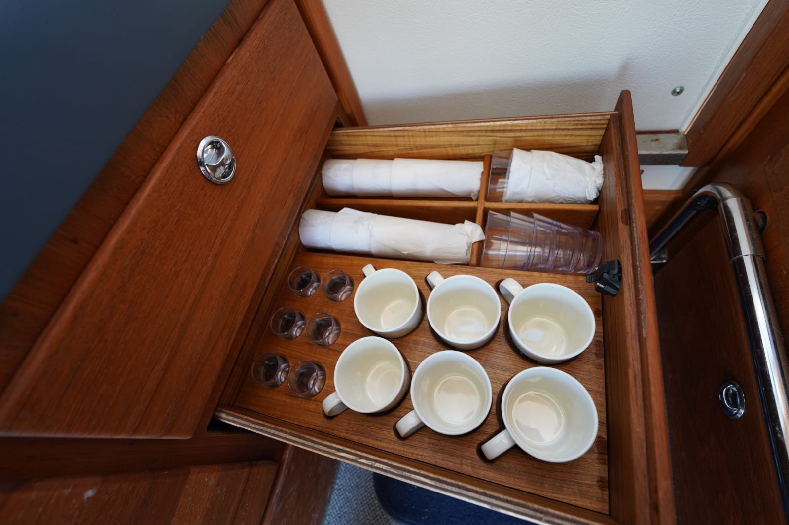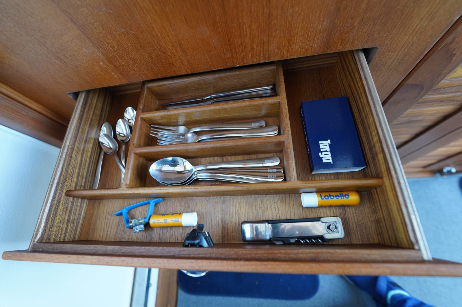 Service de table complet avec logo TARGA, couverts Fiskars et rangement teck sur mesure