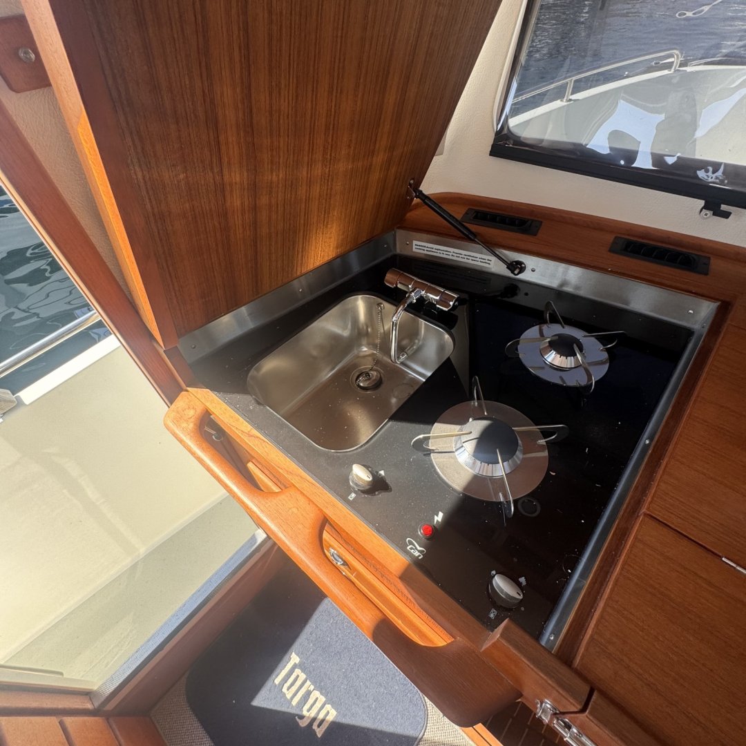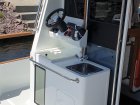Meuble au dos de la timonerie avec évier, douchettes, vivier et rangement