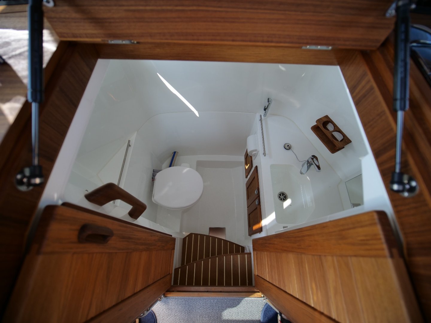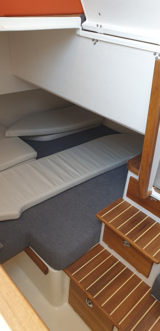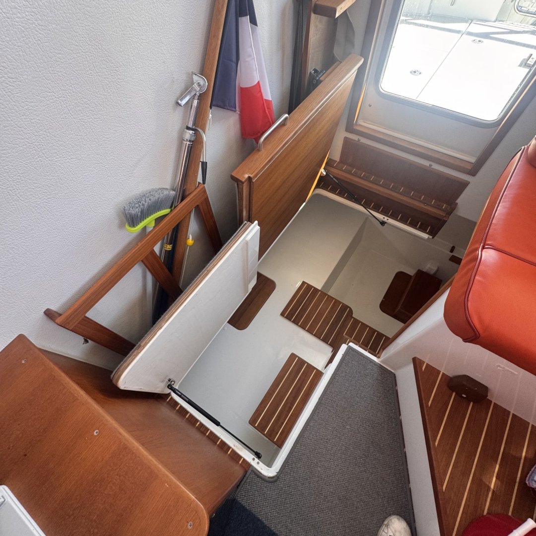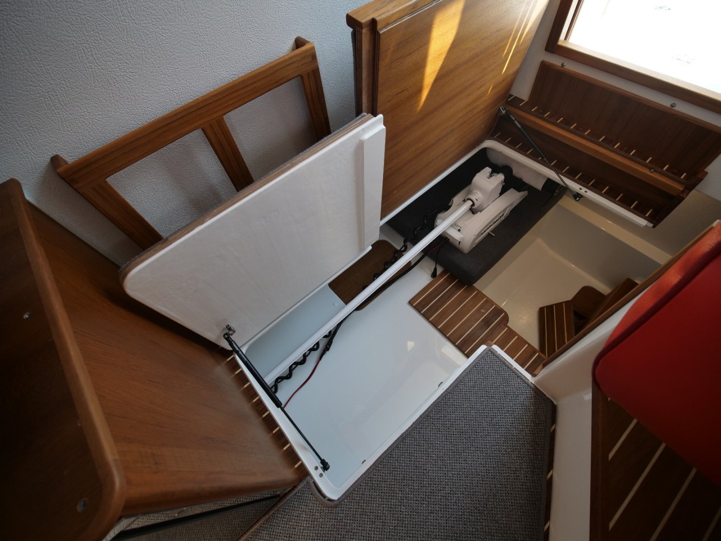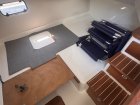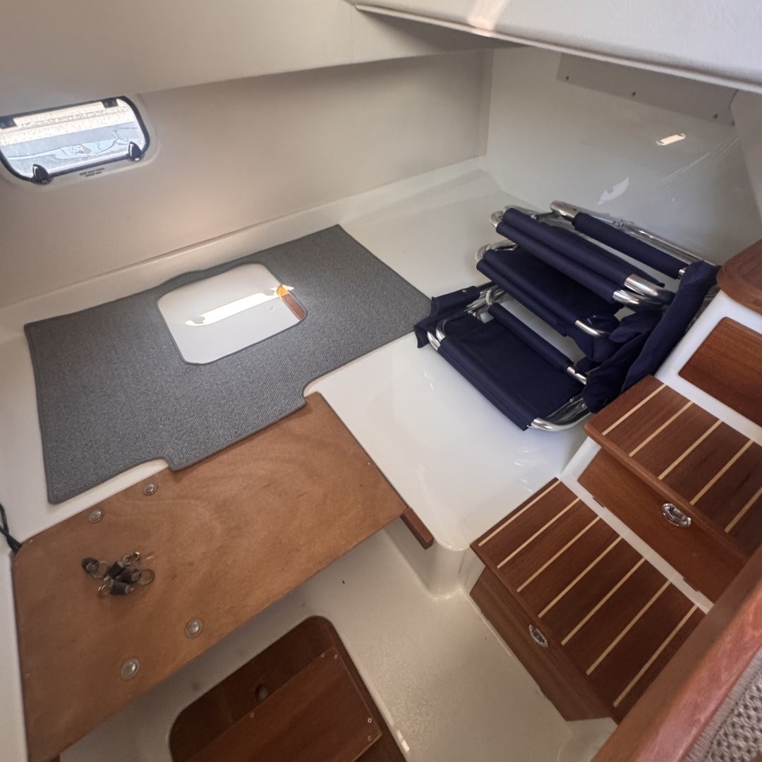 Ouverture au fond du couchage tribord avant pour stockage moteur (MinnKota)