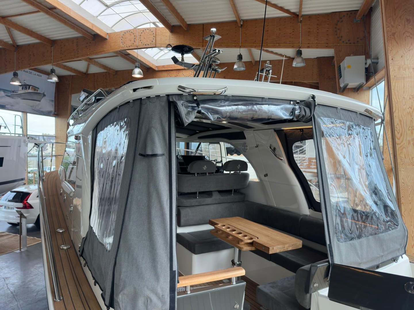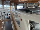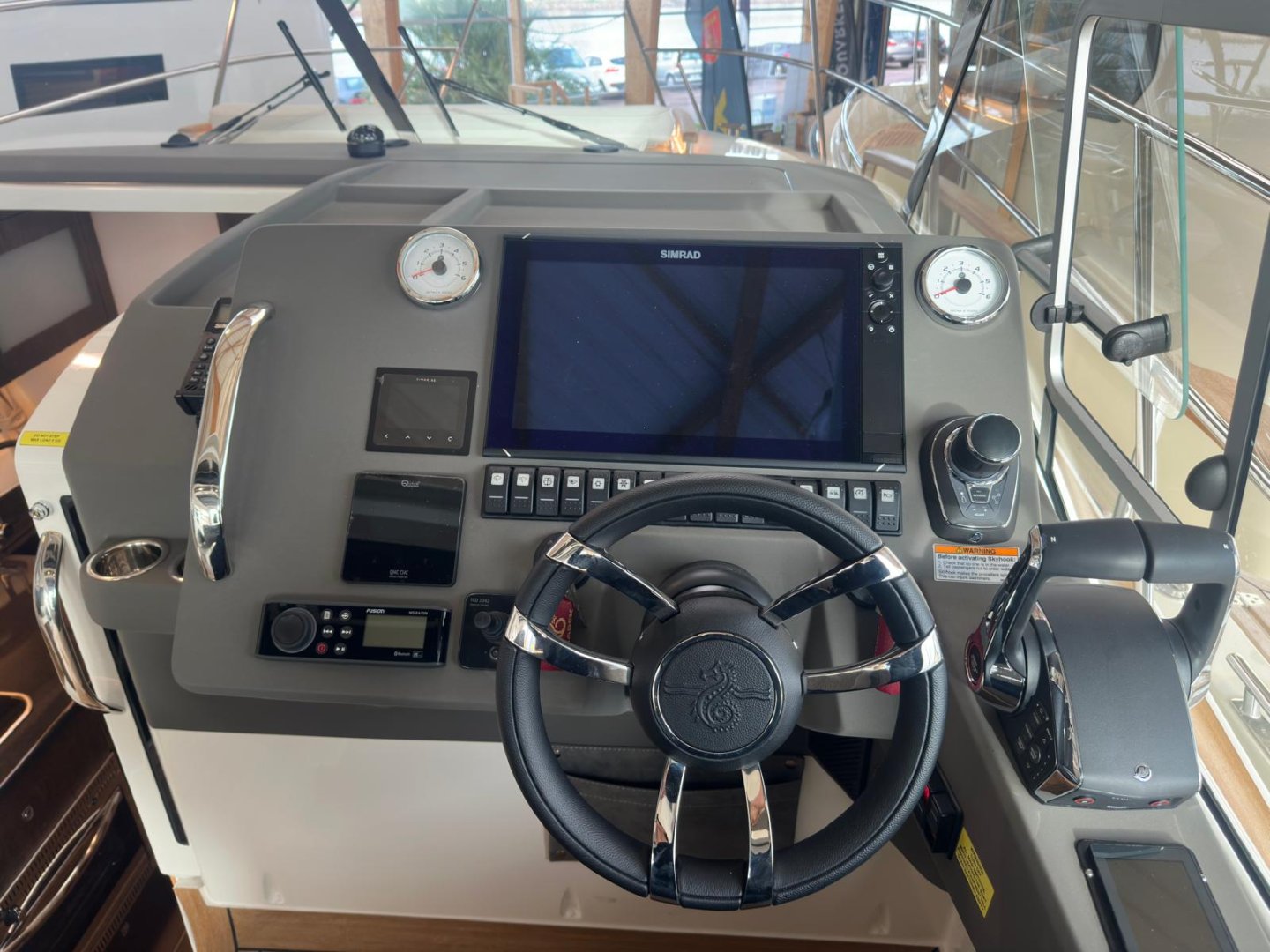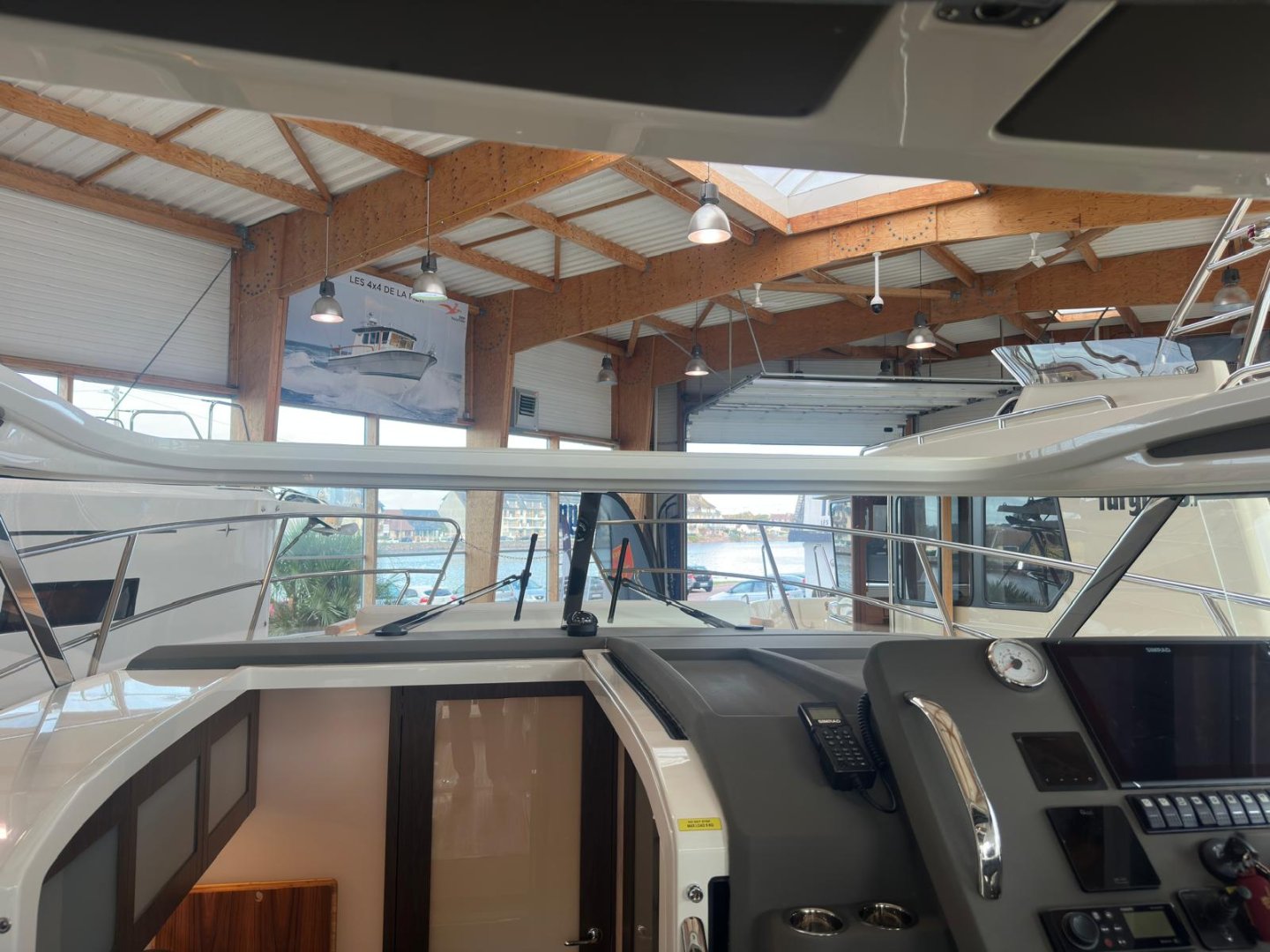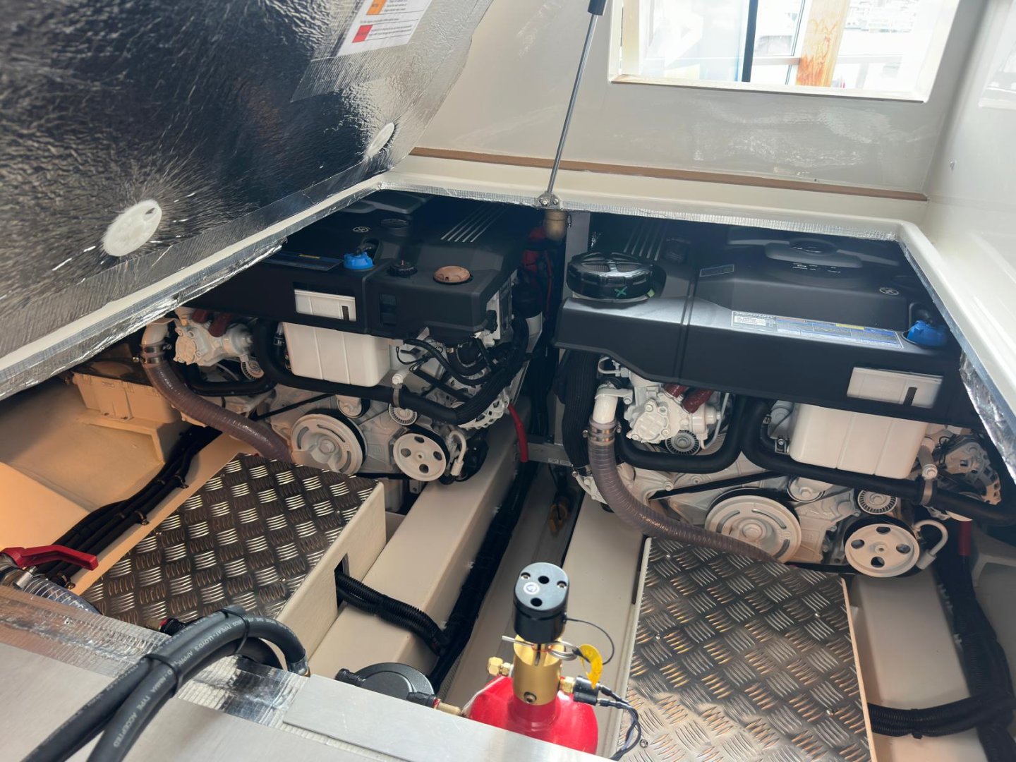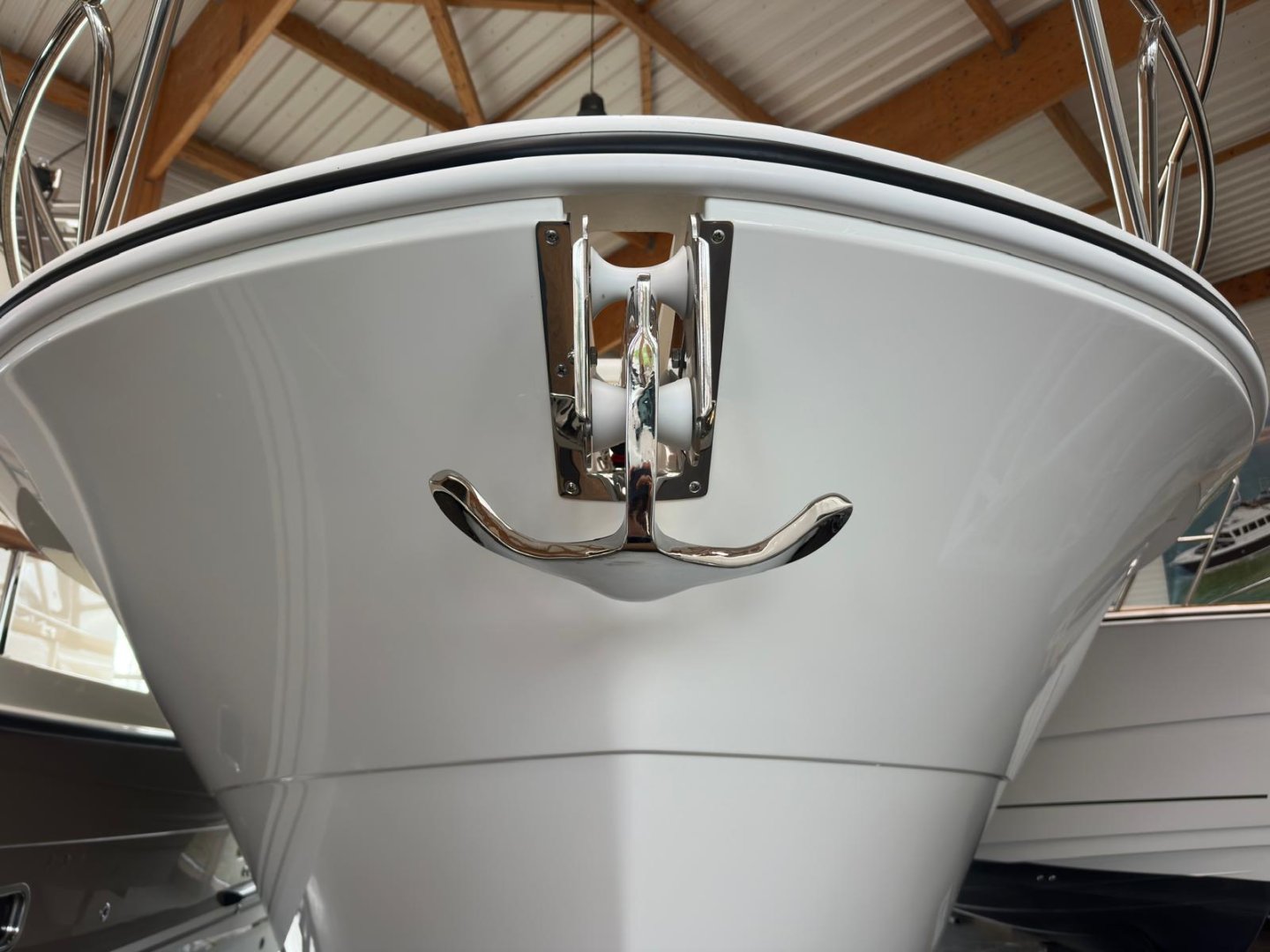 Il est équipé de 2 moteurs Mercury Diesel de 270cv et bénéficie d’un équipement complet de série avec des options essentielles : joystick de manoeuvre, pilote automatique, Humphree Interceptors, électronique Simrad très complète, avec un grand écran de 16 pouces et une VHF.