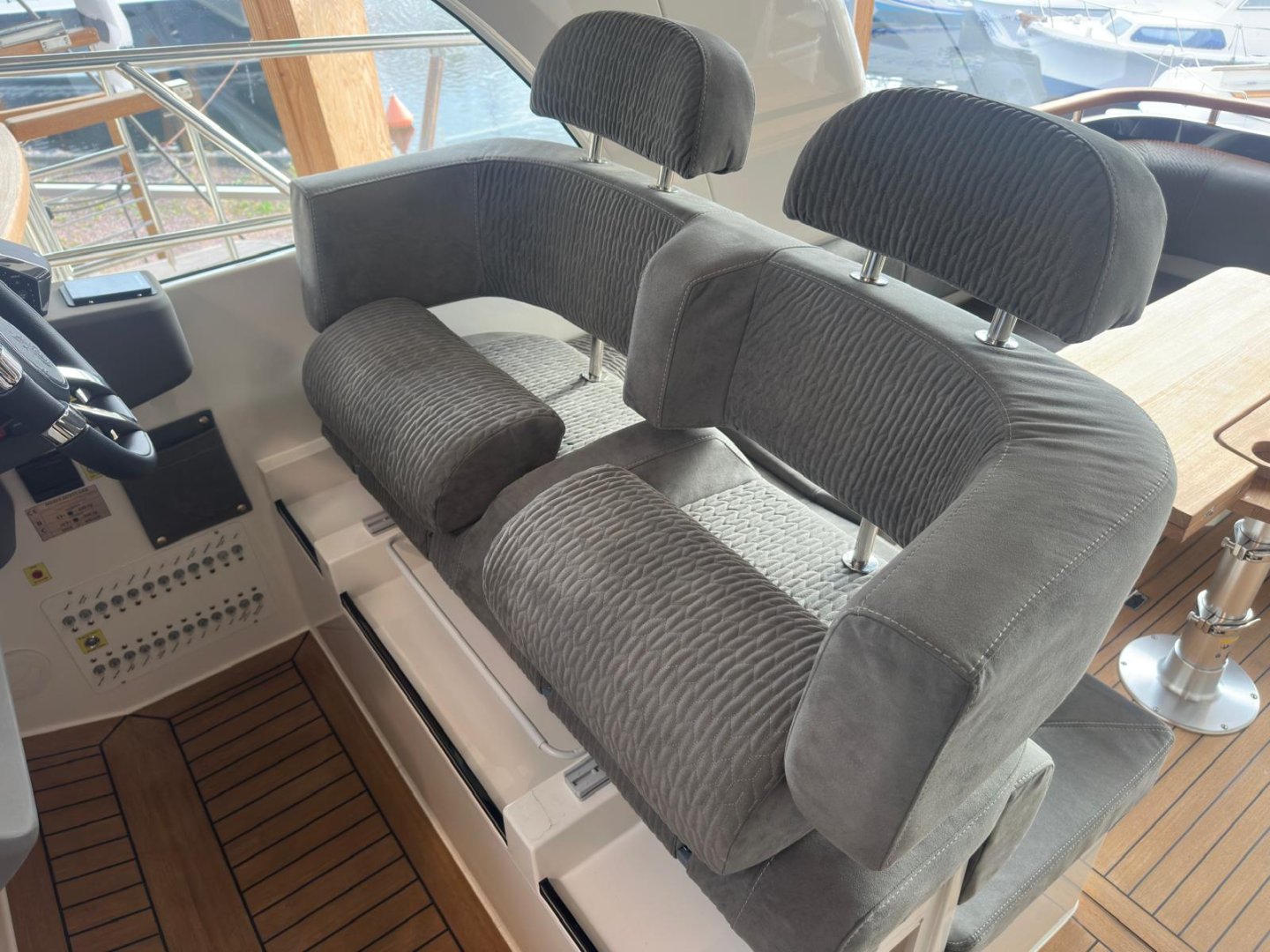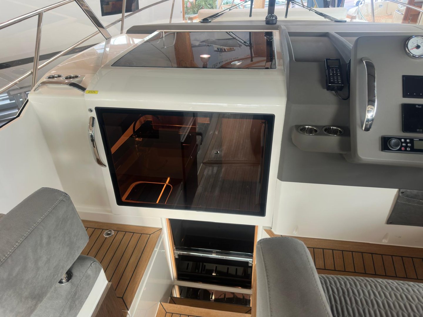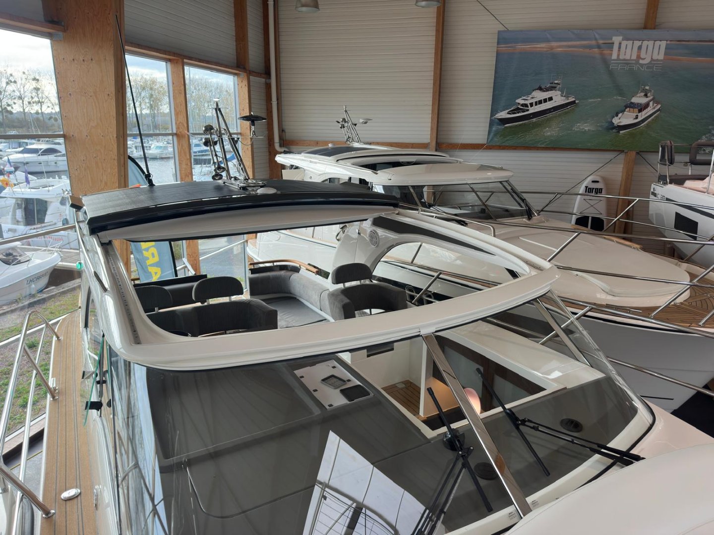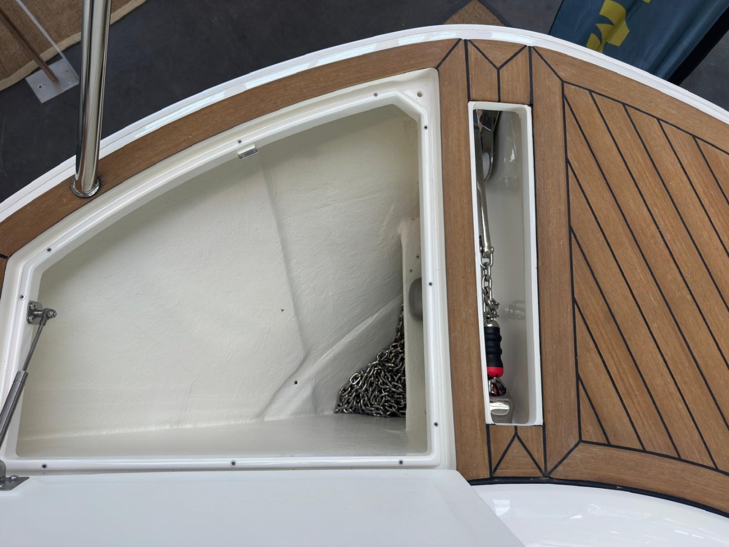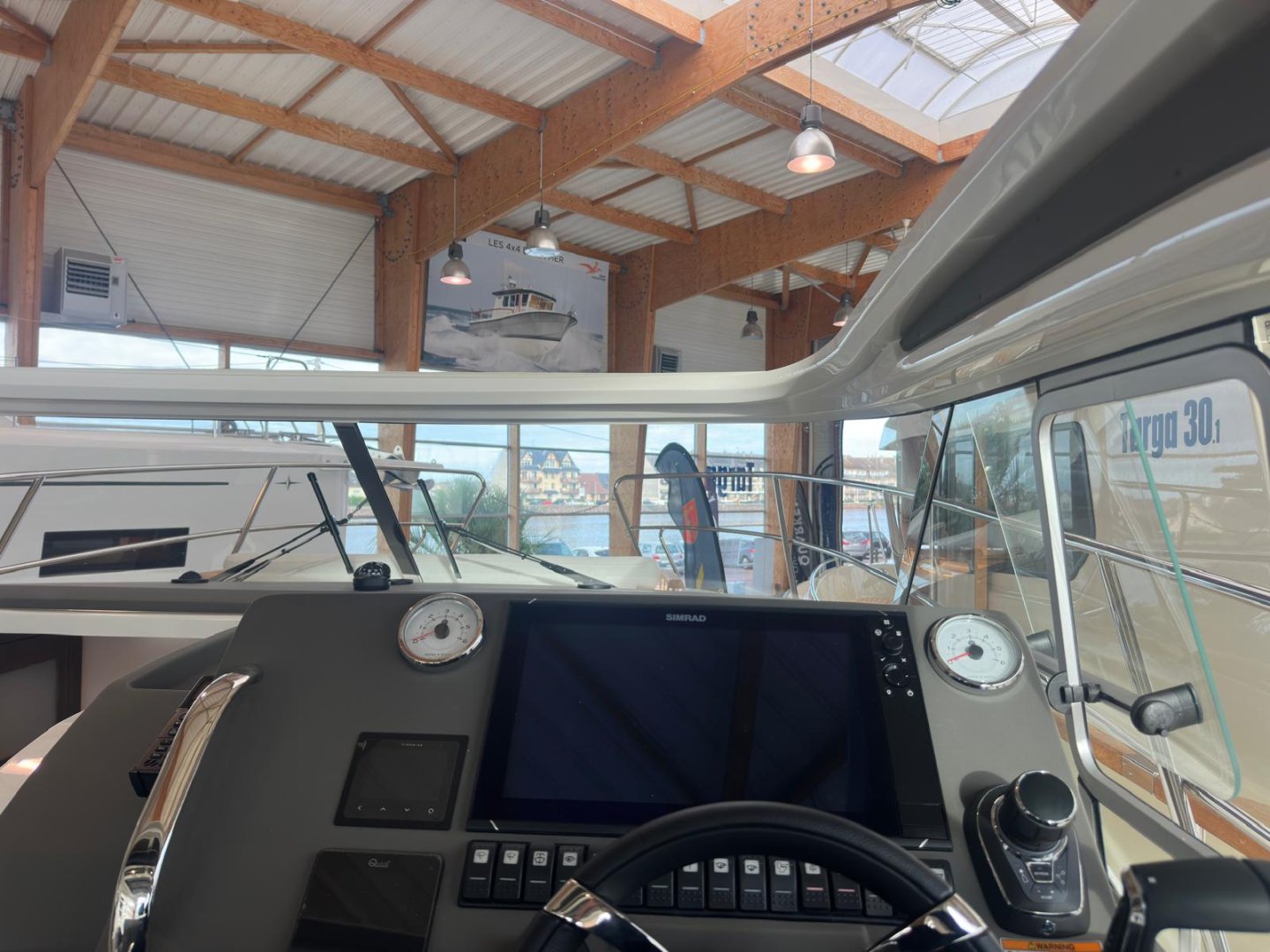 Il est équipé de 2 moteurs Mercury Diesel de 270cv et bénéficie d’un équipement complet de série avec des options essentielles : joystick de manoeuvre, pilote automatique, Humphree Interceptors, électronique Simrad très complète, avec un grand écran de 16 pouces et une VHF.