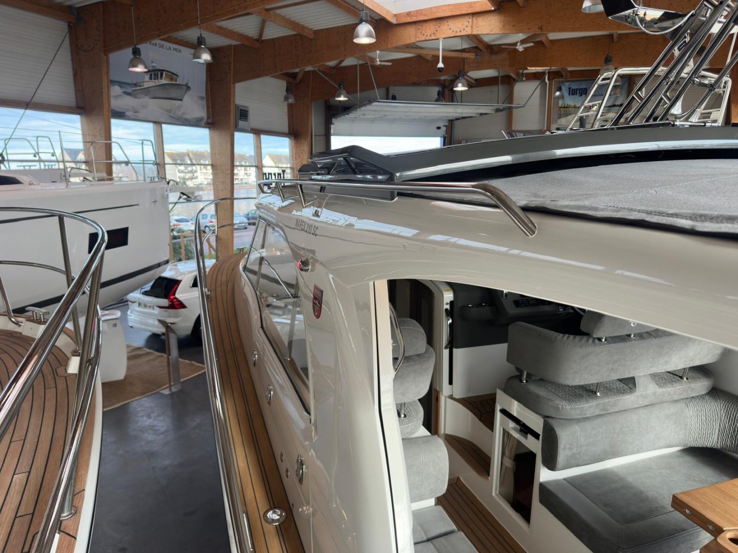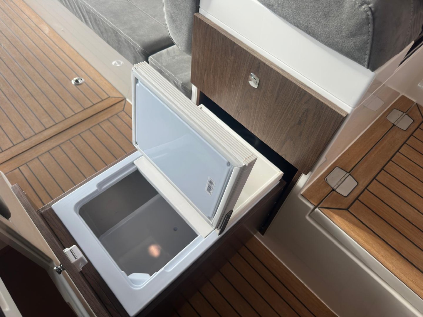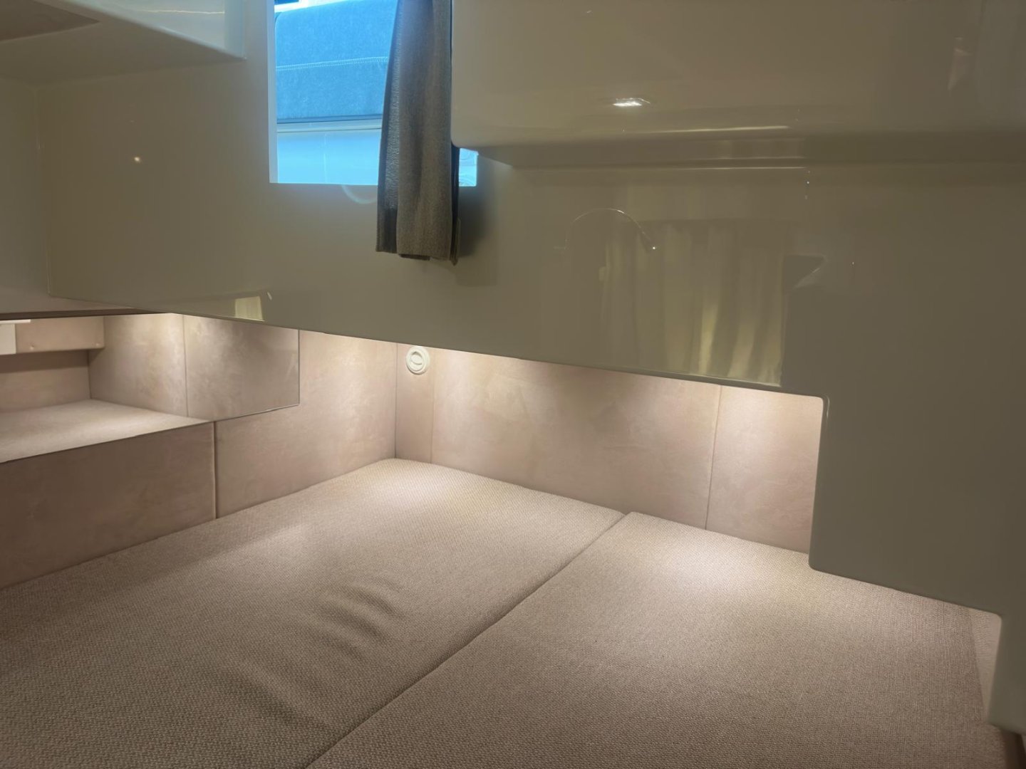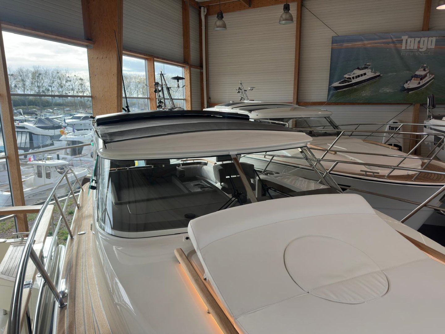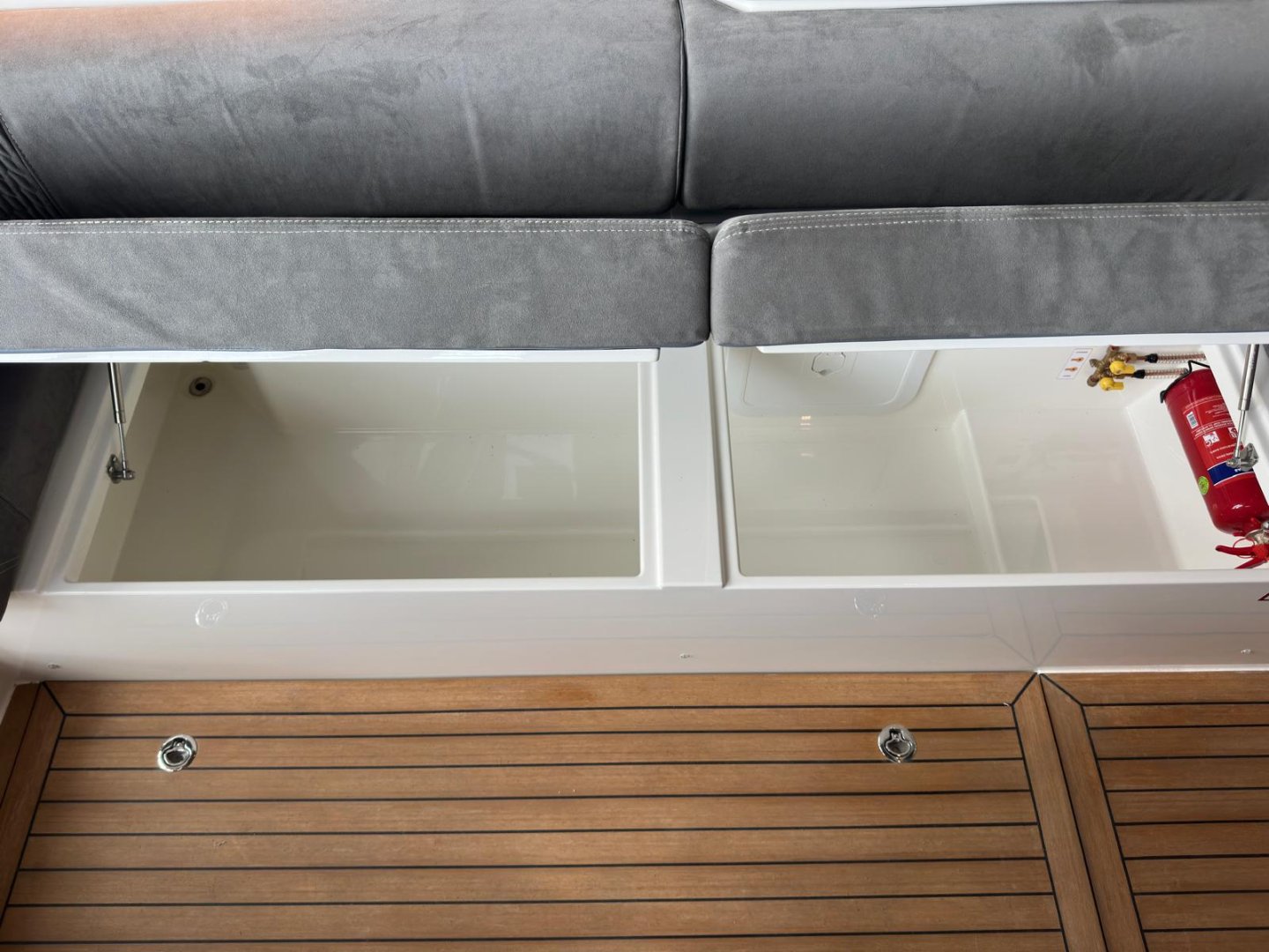 Il est équipé de 2 moteurs Mercury Diesel de 270cv et bénéficie d’un équipement complet de série avec des options essentielles : joystick de manoeuvre, pilote automatique, Humphree Interceptors, électronique Simrad très complète, avec un grand écran de 16 pouces et une VHF.