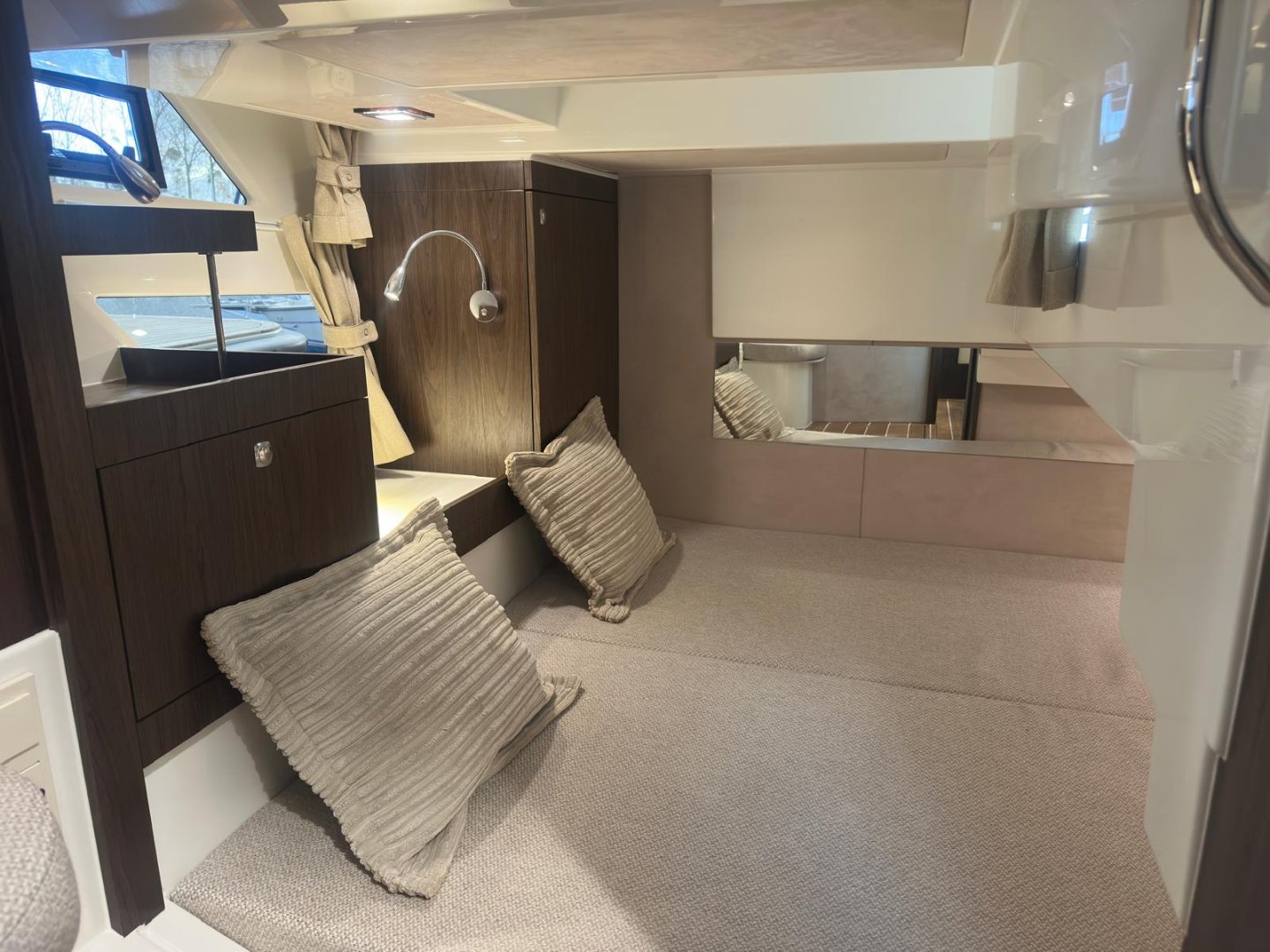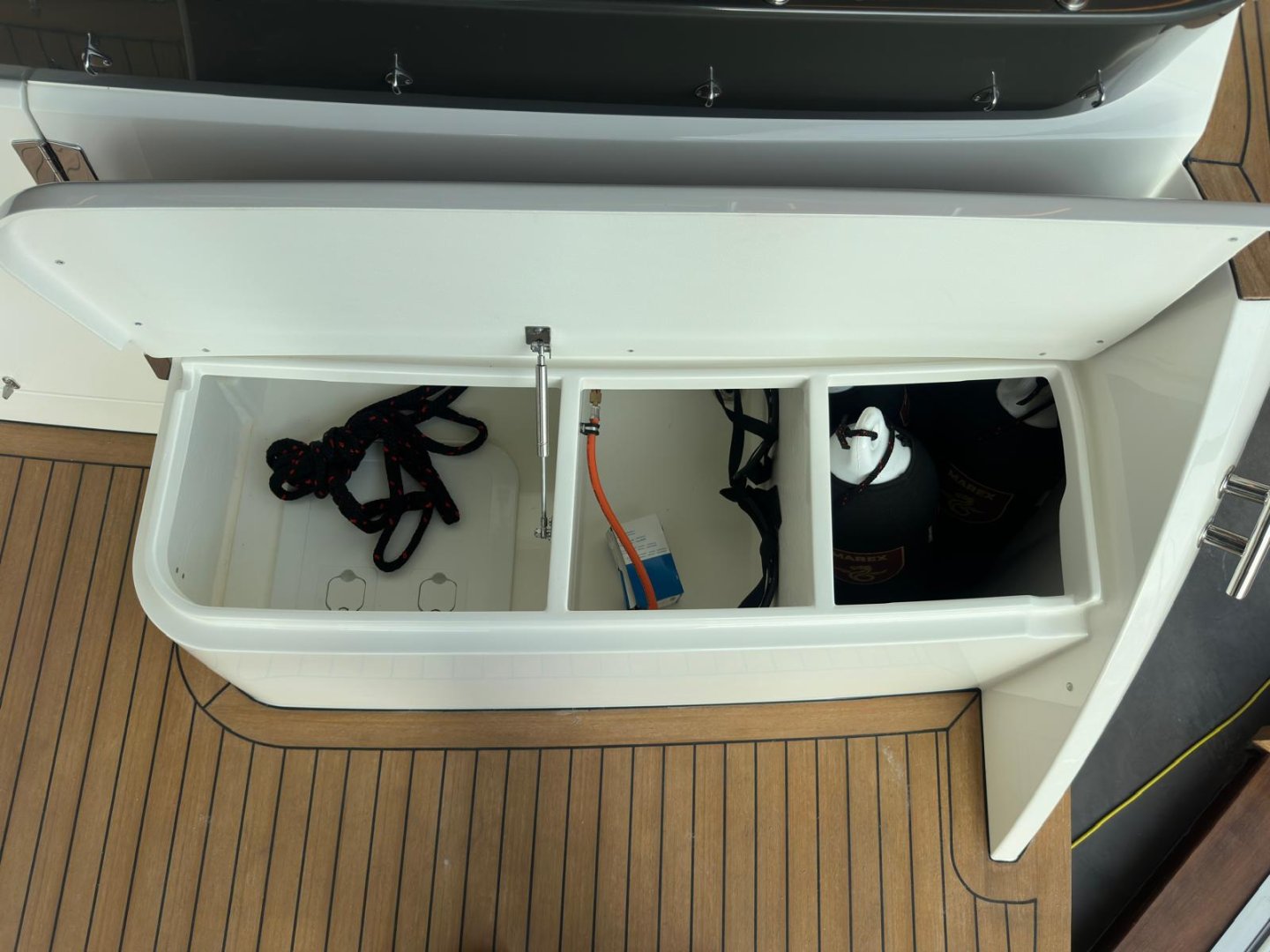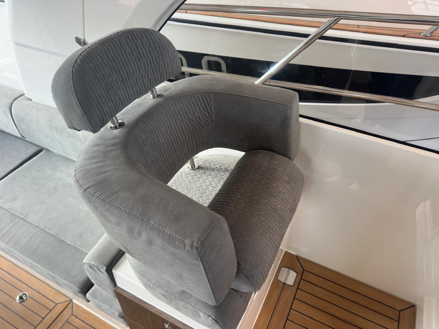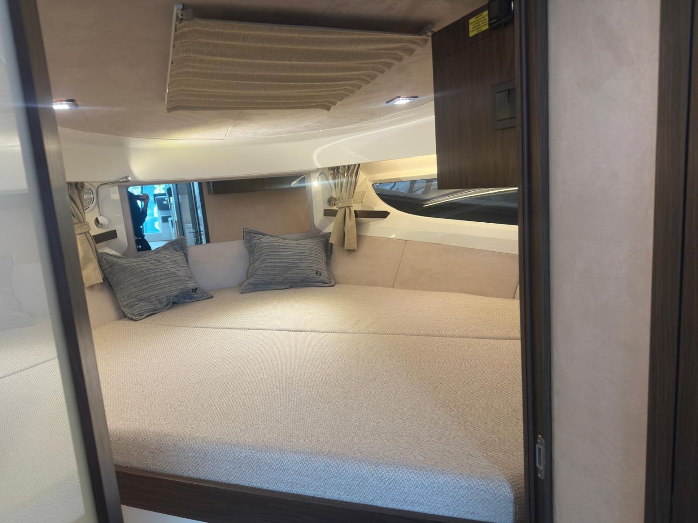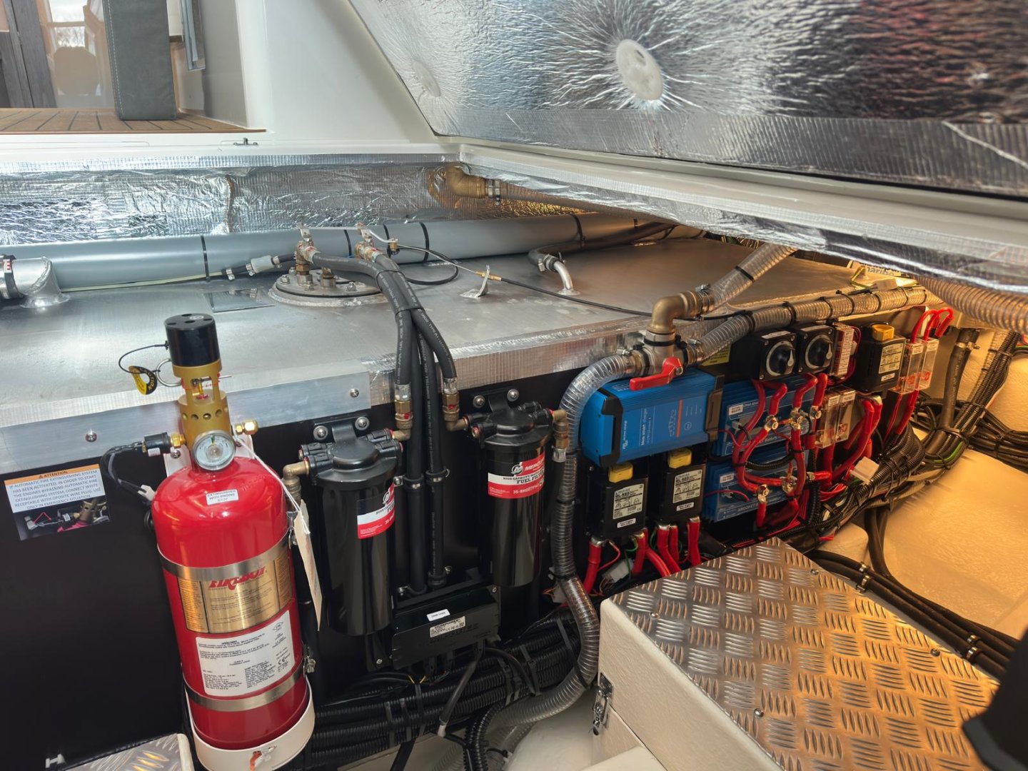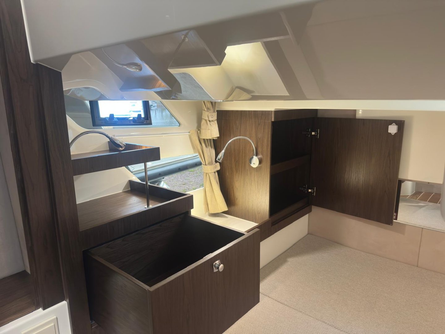Il est équipé de 2 moteurs Mercury Diesel de 270cv et bénéficie d’un équipement complet de série avec des options essentielles : joystick de manoeuvre, pilote automatique, Humphree Interceptors, électronique Simrad très complète, avec un grand écran de 16 pouces et une VHF.