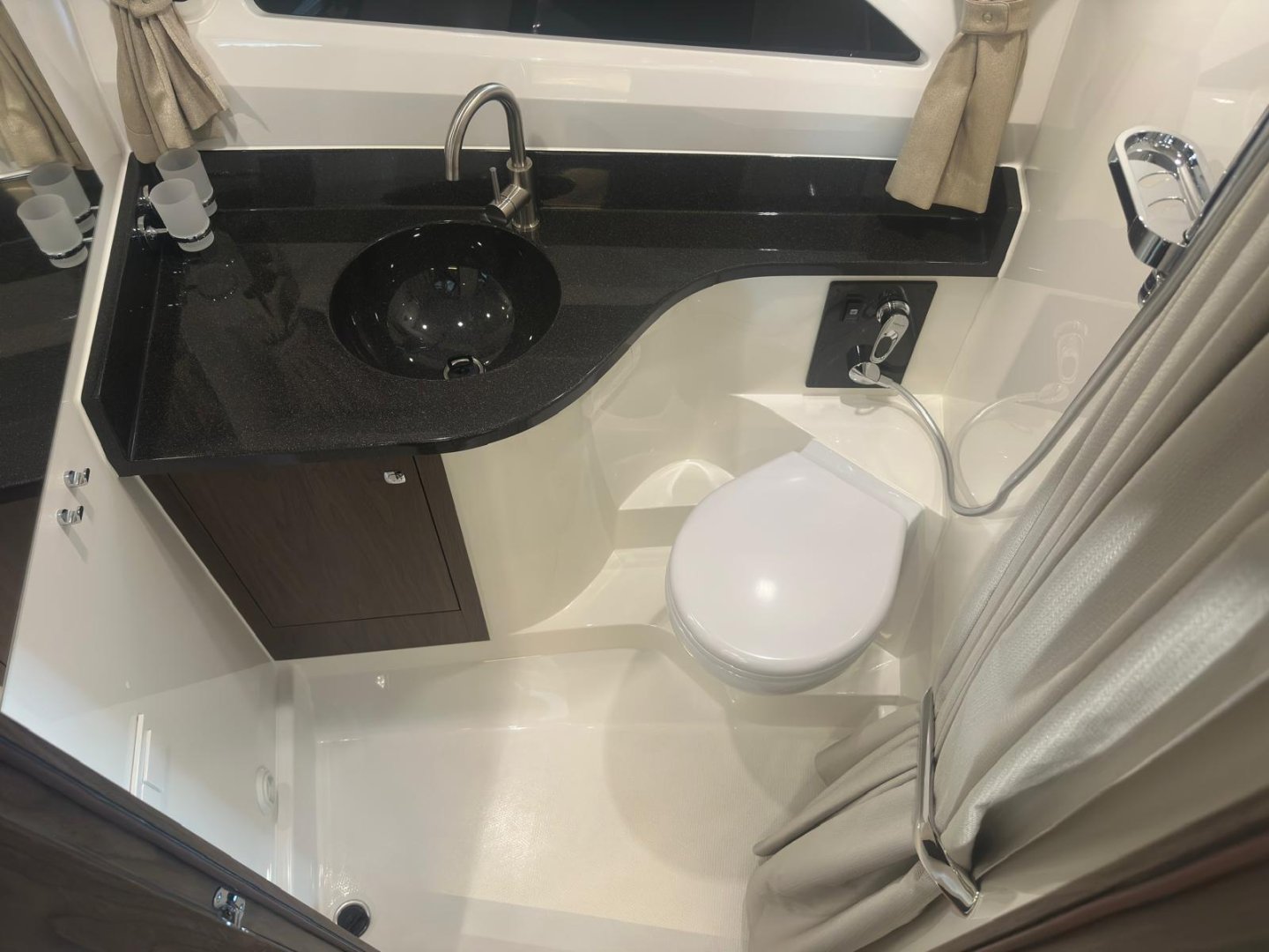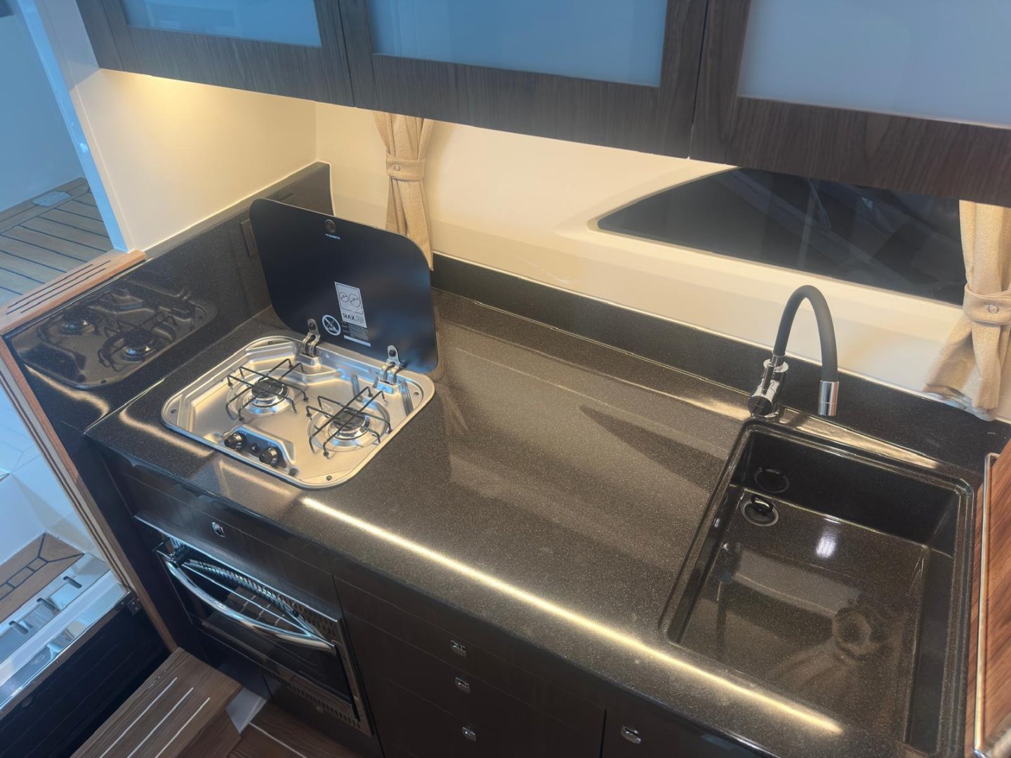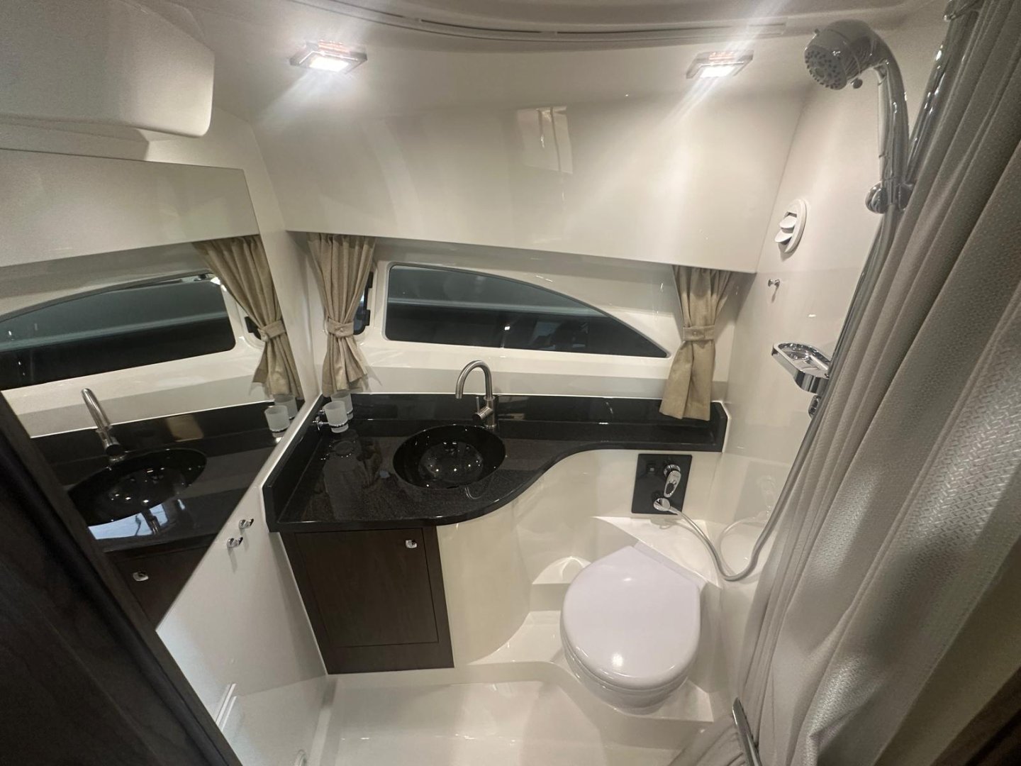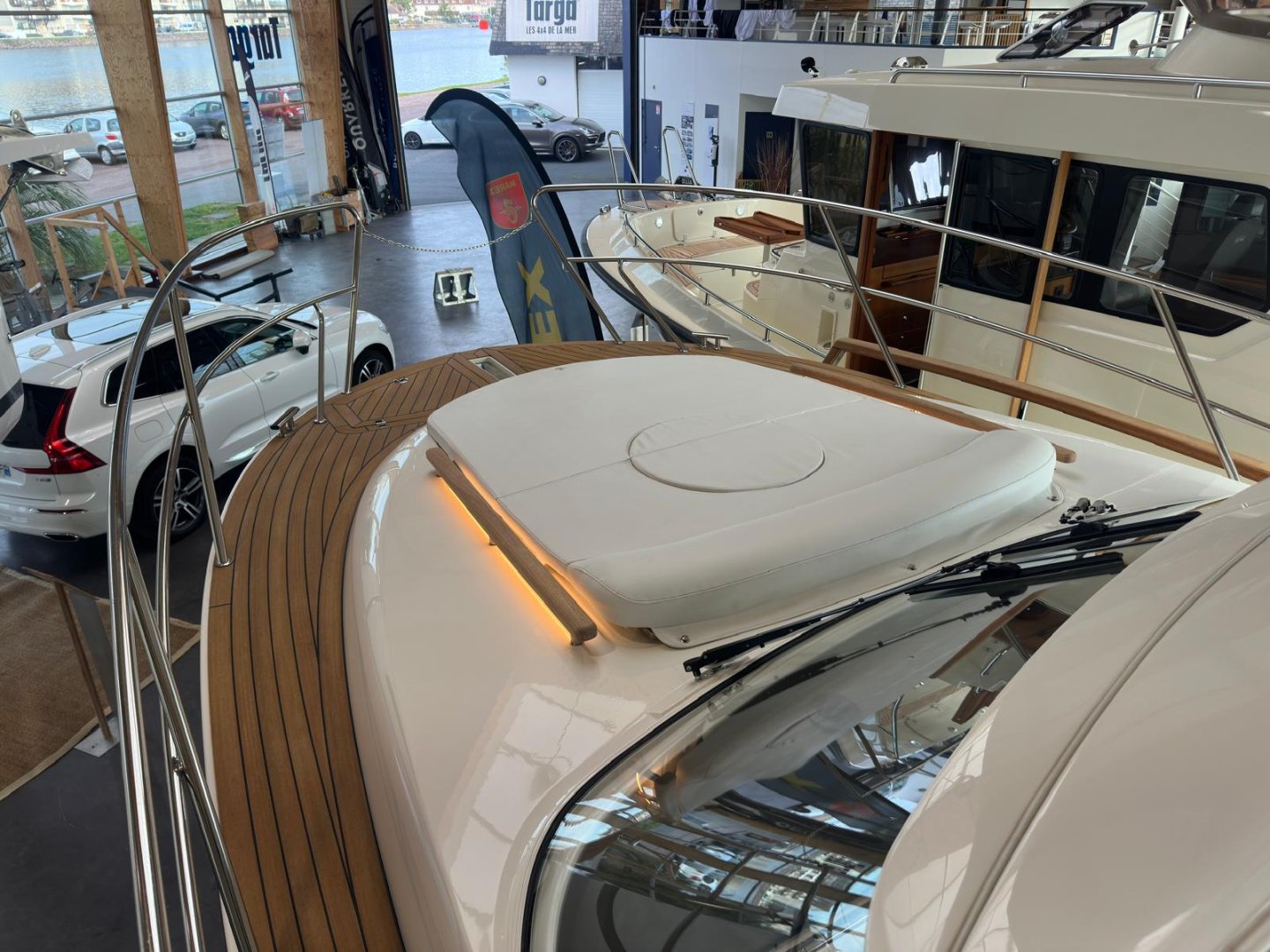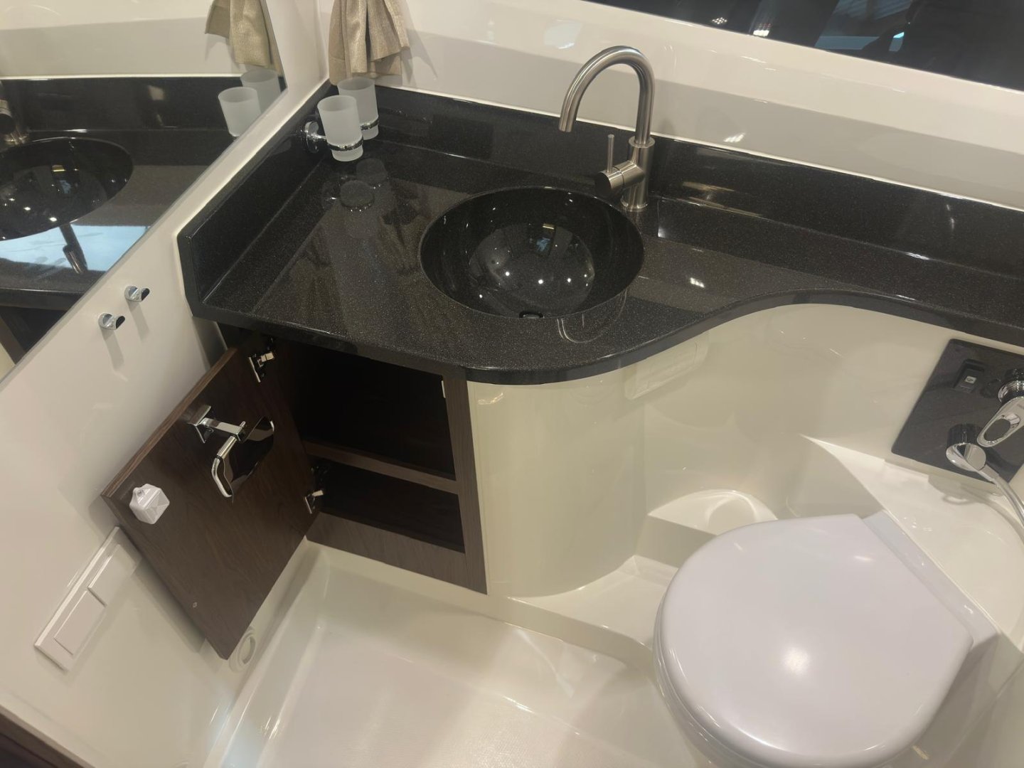 Il est équipé de 2 moteurs Mercury Diesel de 270cv et bénéficie d’un équipement complet de série avec des options essentielles : joystick de manoeuvre, pilote automatique, Humphree Interceptors, électronique Simrad très complète, avec un grand écran de 16 pouces et une VHF.