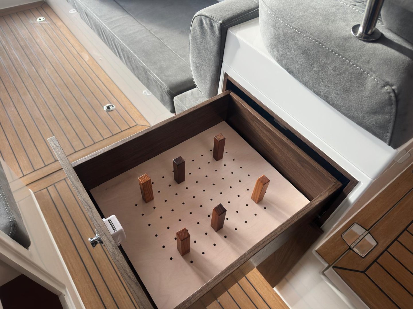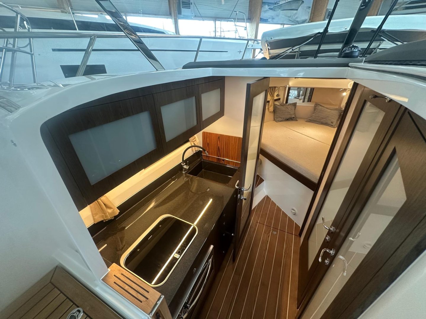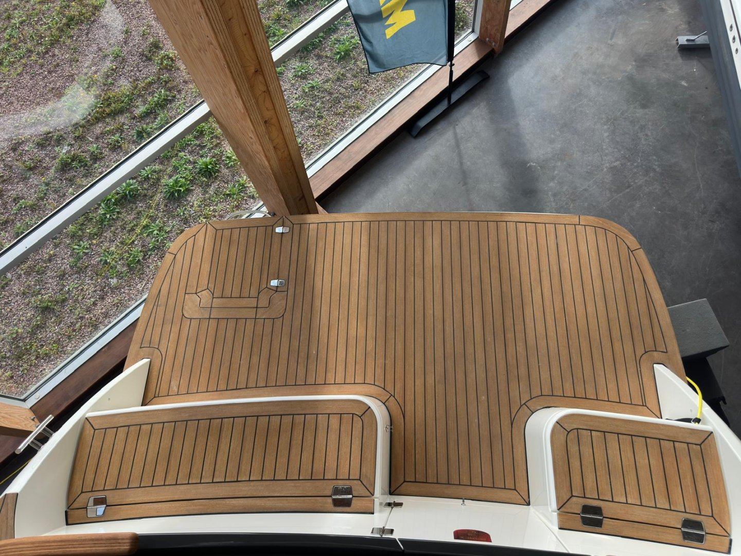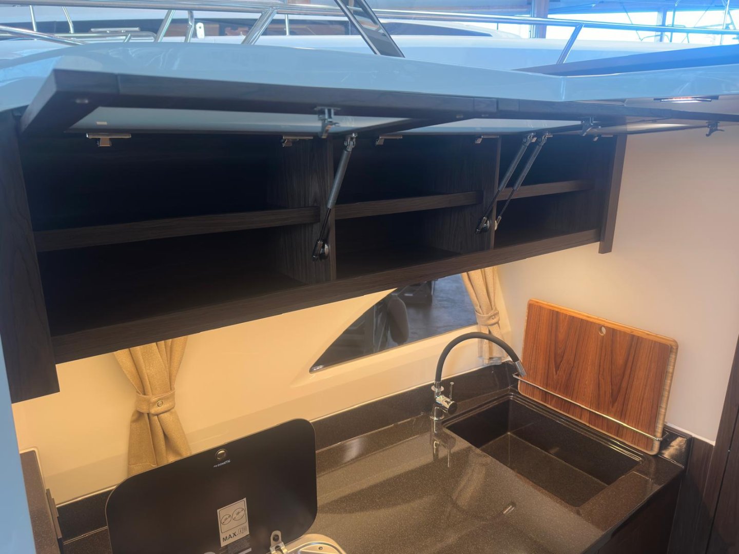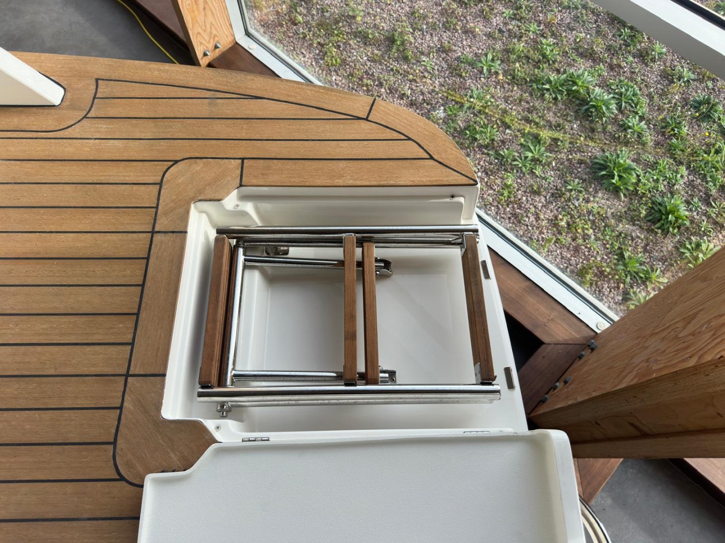 Il est équipé de 2 moteurs Mercury Diesel de 270cv et bénéficie d’un équipement complet de série avec des options essentielles : joystick de manoeuvre, pilote automatique, Humphree Interceptors, électronique Simrad très complète, avec un grand écran de 16 pouces et une VHF.