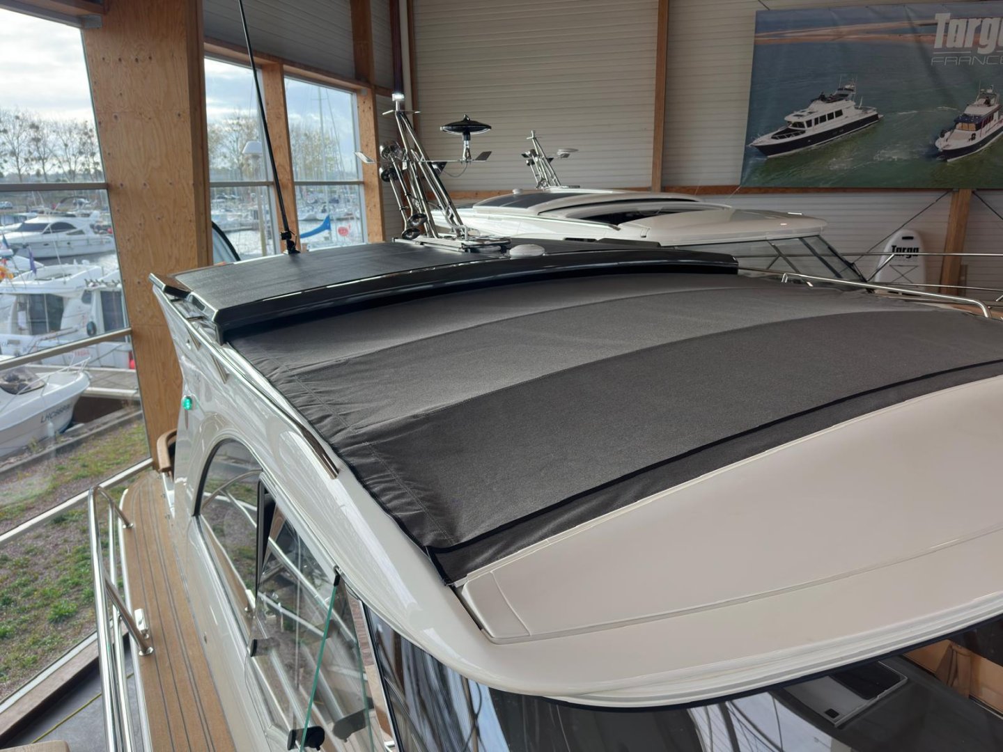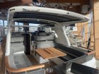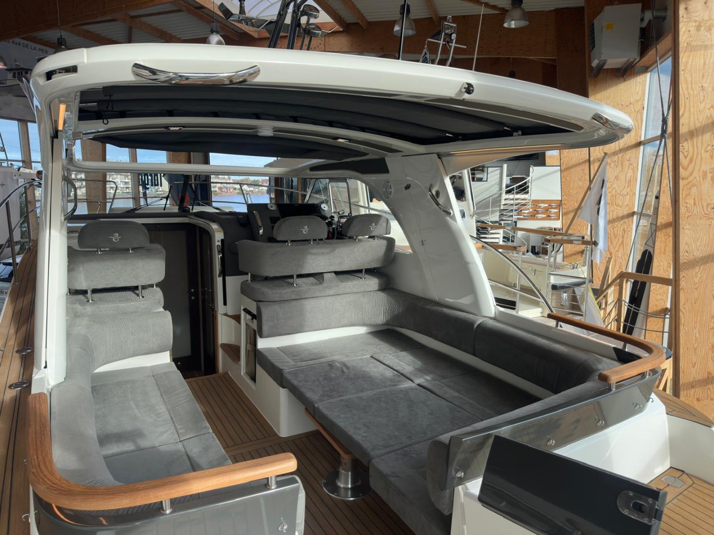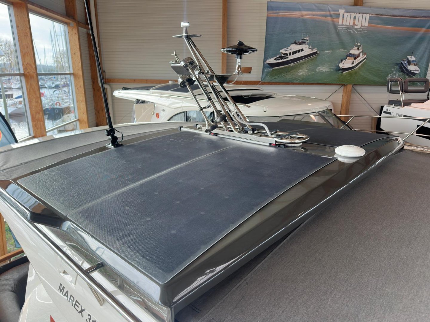 Ce cabin cruiser d’une incroyable polyvalence est présenté ici dans une nouvelle version, avec plate-forme de bain allongée, nouveaux panneaux solaires plus puissants (450W) et casquette de toit qui reprend la forme du Marex 440 et du nouveau Marex 390.