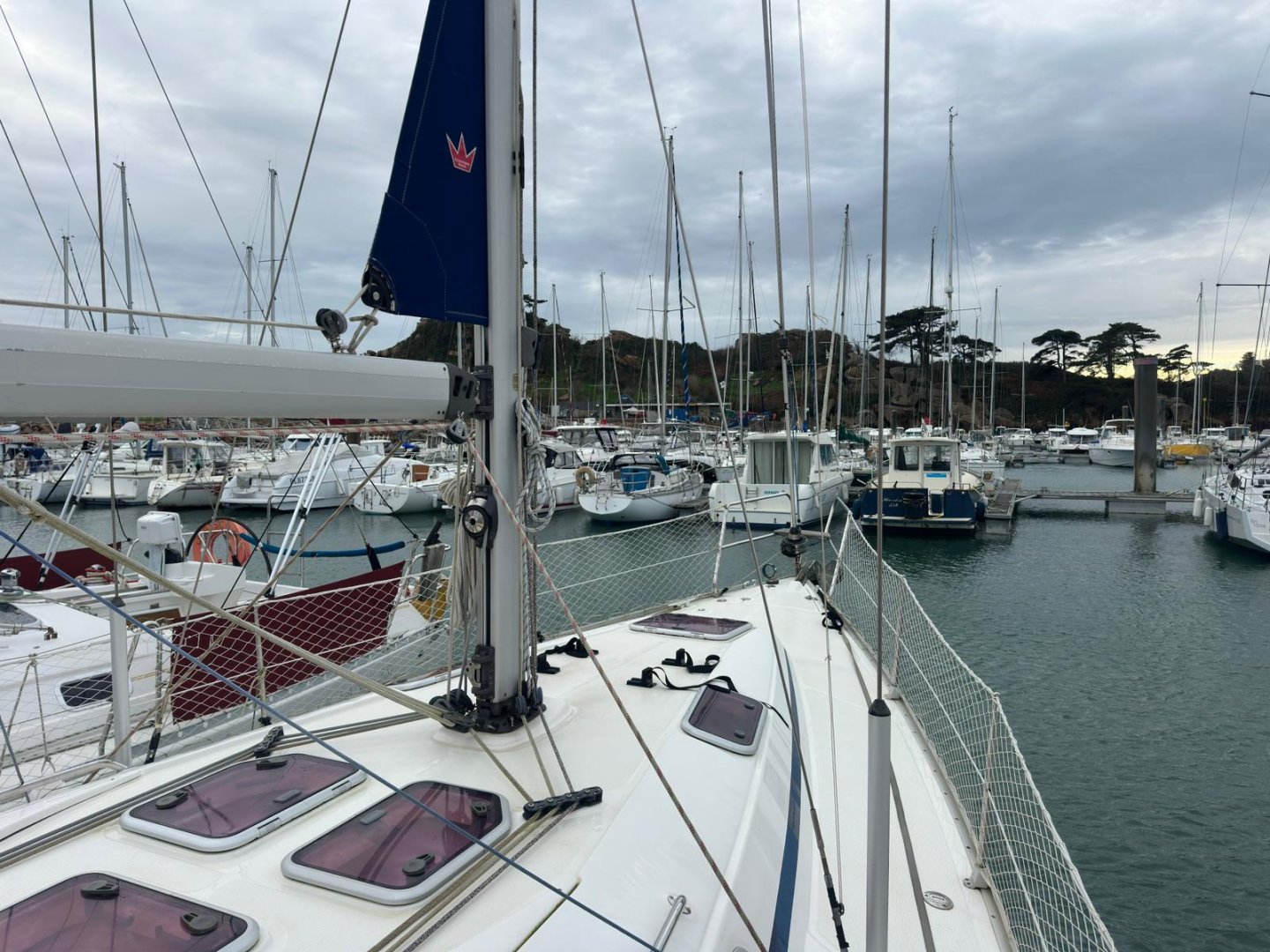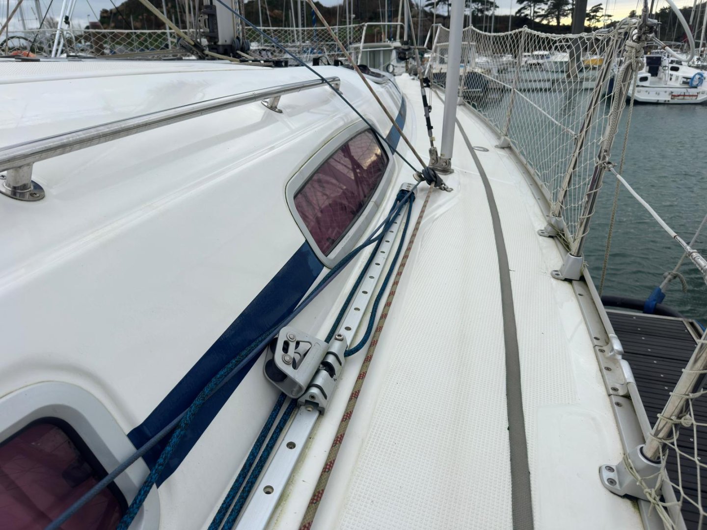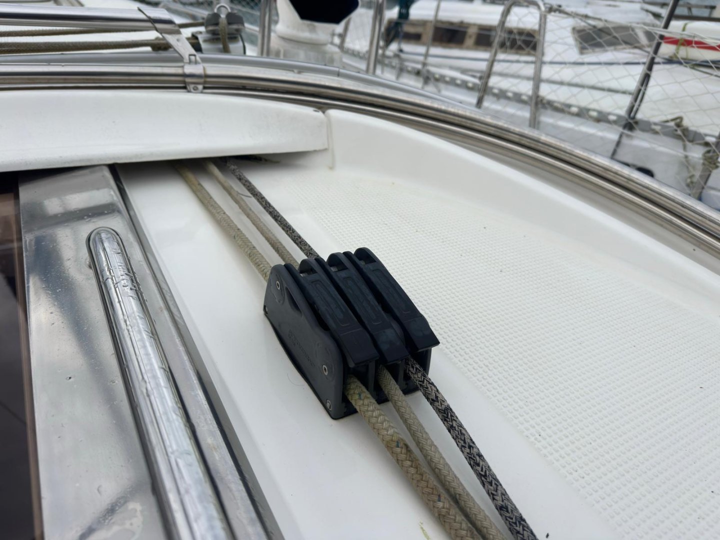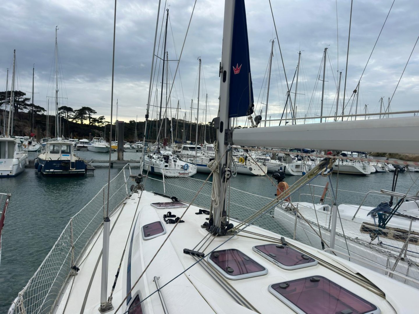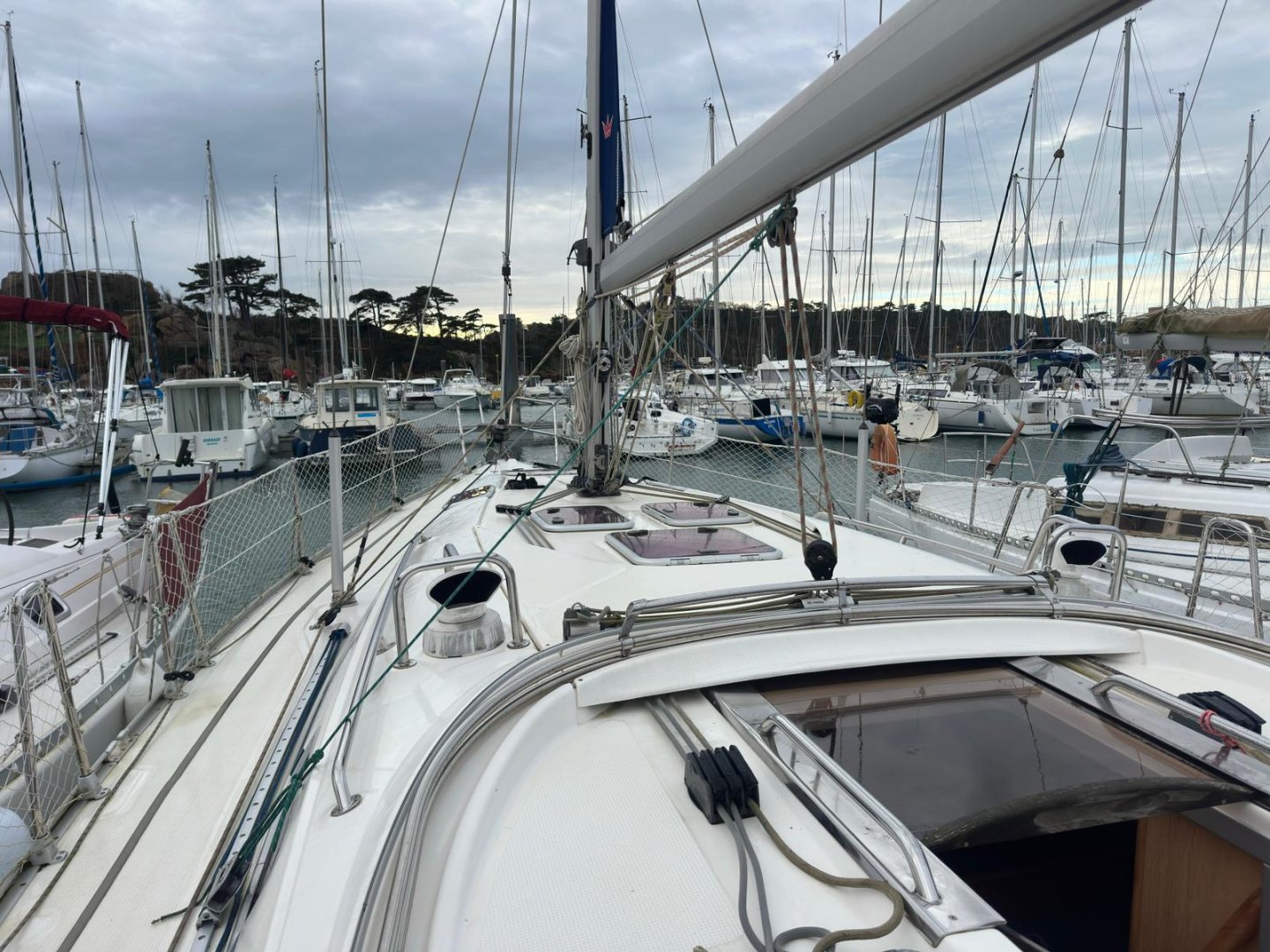 Moteur Volvo Penta D2-40 – 40 CV (1 600 h), entretien suivi. Gréement récent, grand-voile sur enrouleur, génois et Code 0 pour une navigation polyvalente et performante.