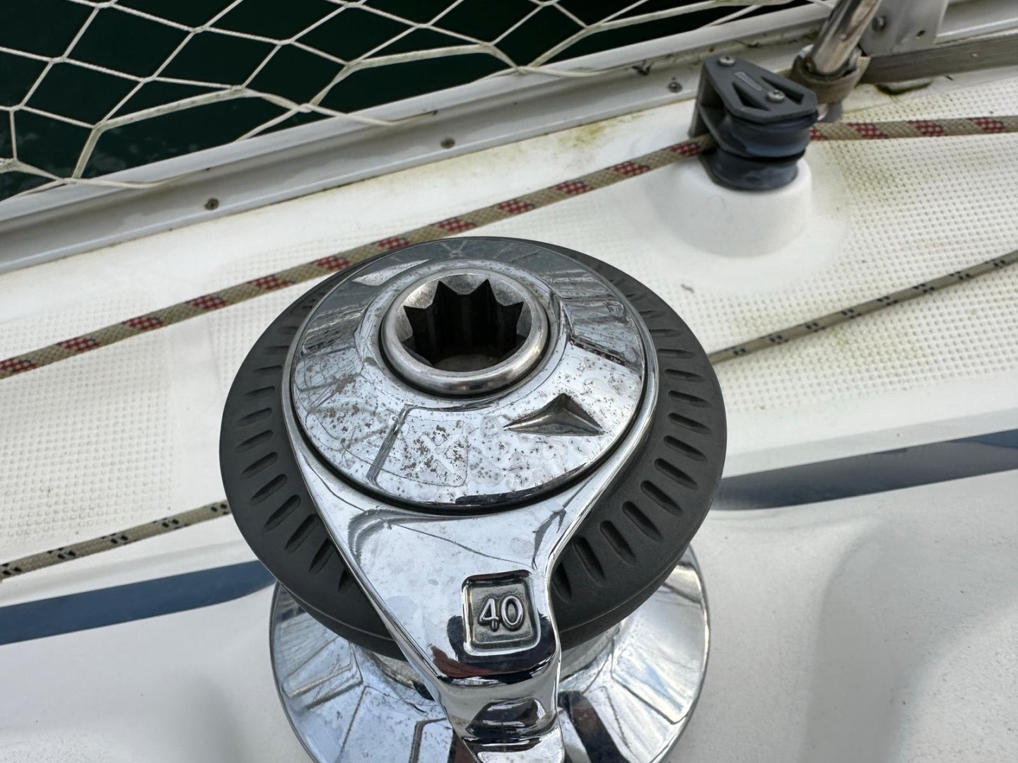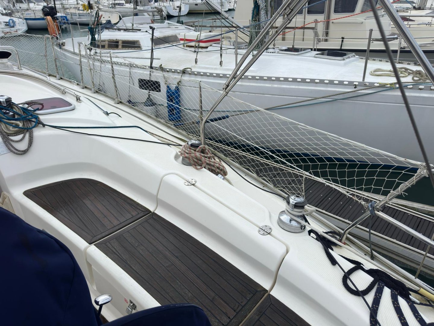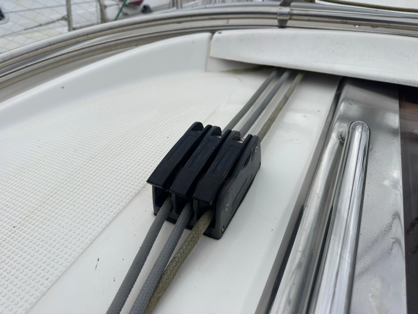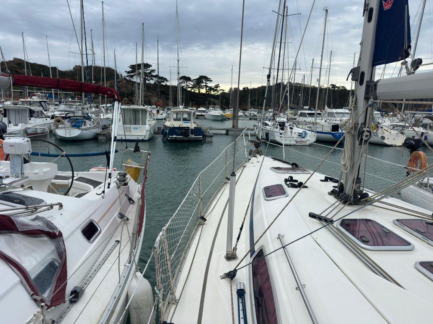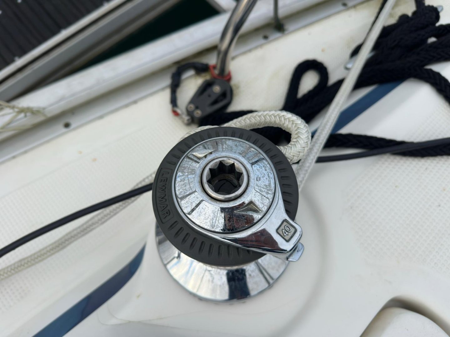 Moteur Volvo Penta D2-40 – 40 CV (1 600 h), entretien suivi. Gréement récent, grand-voile sur enrouleur, génois et Code 0 pour une navigation polyvalente et performante.