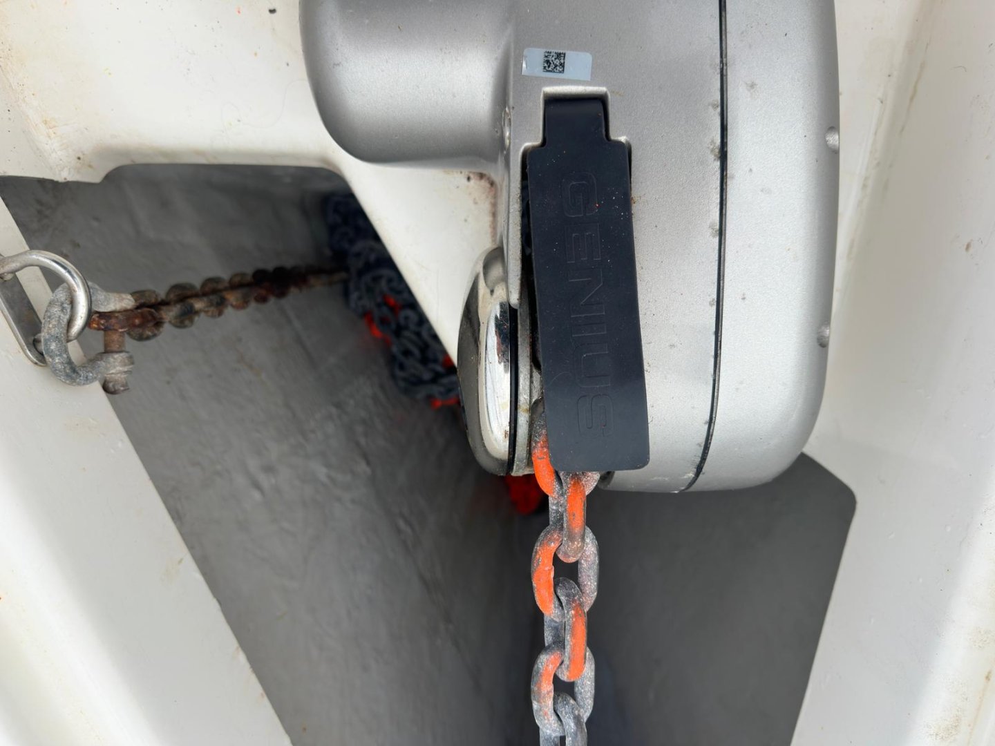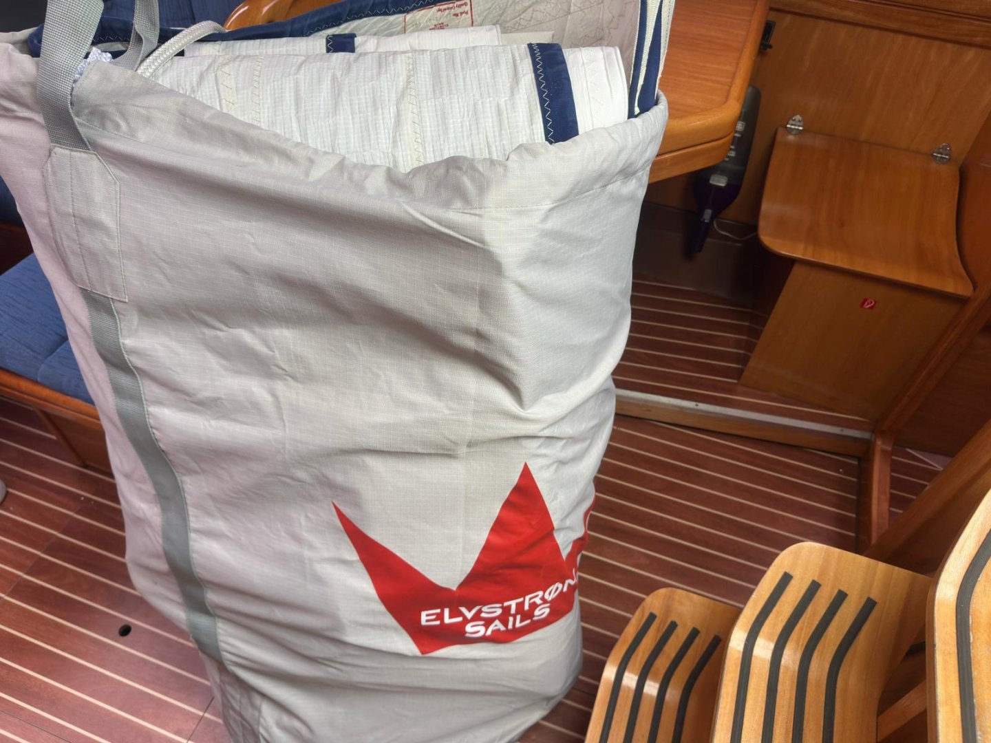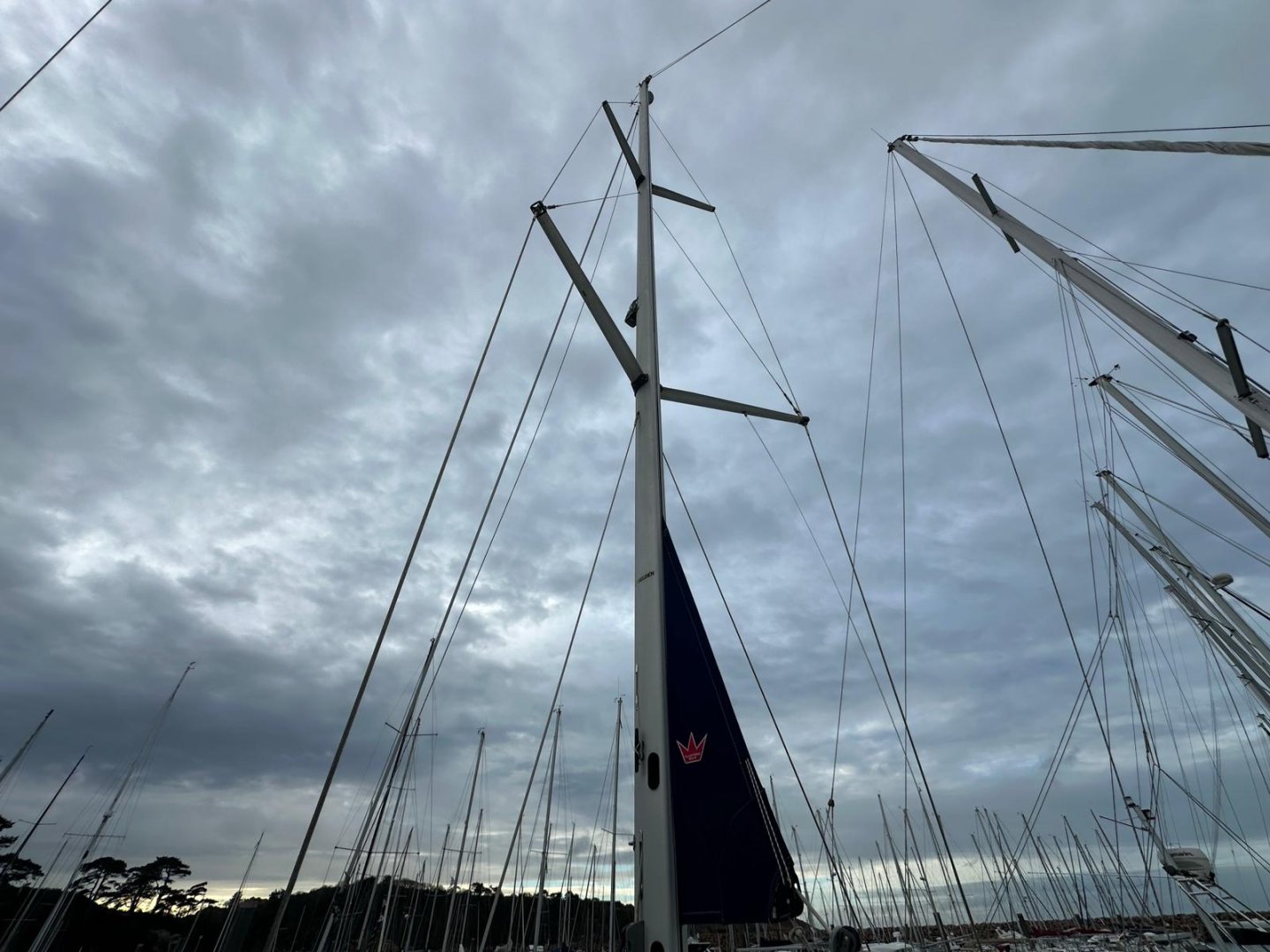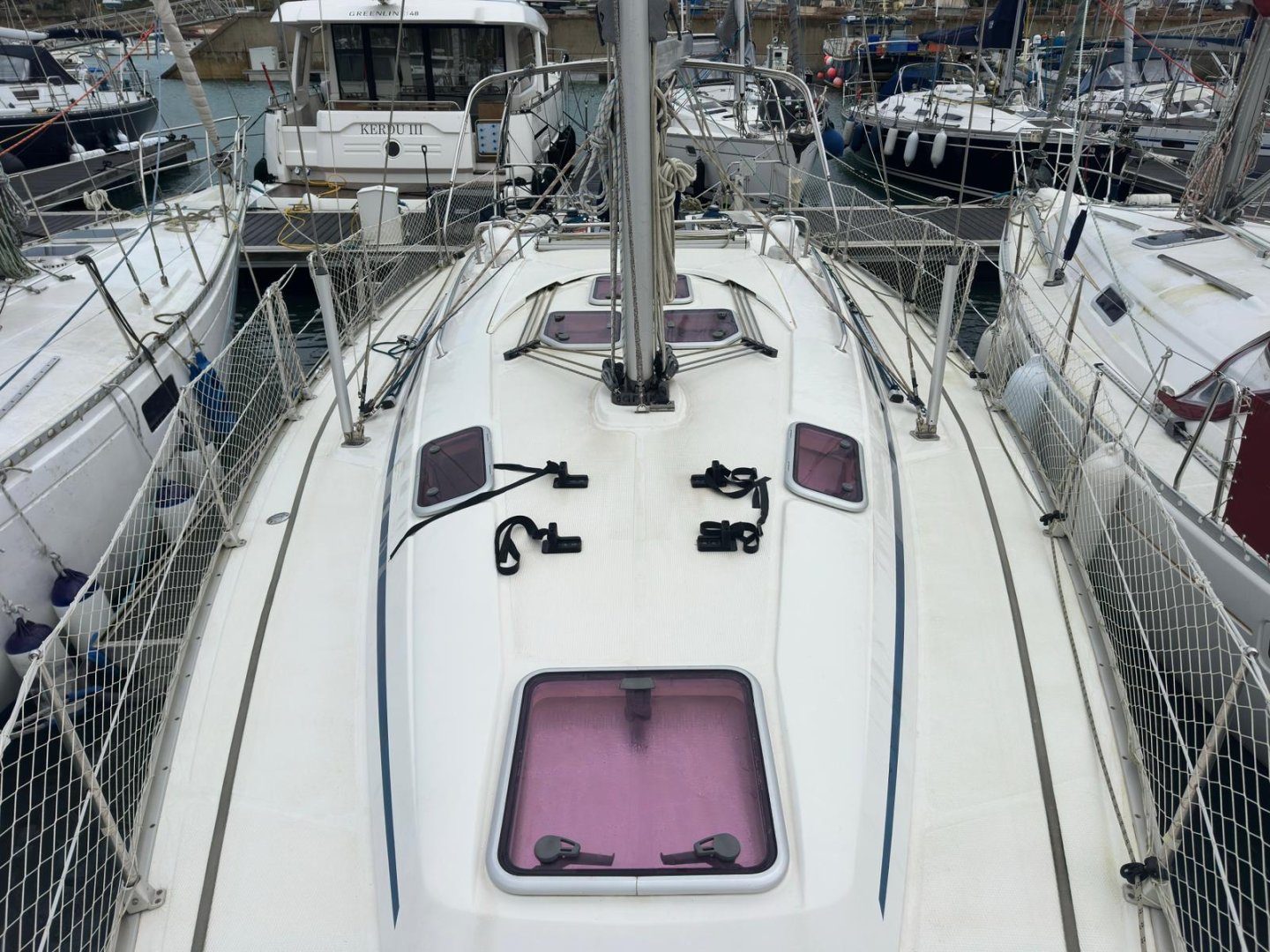 Moteur Volvo Penta D2-40 – 40 CV (1 600 h), entretien suivi. Gréement récent, grand-voile sur enrouleur, génois et Code 0 pour une navigation polyvalente et performante.