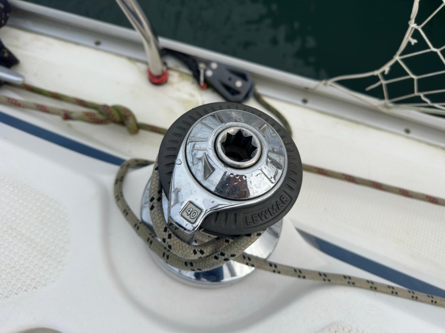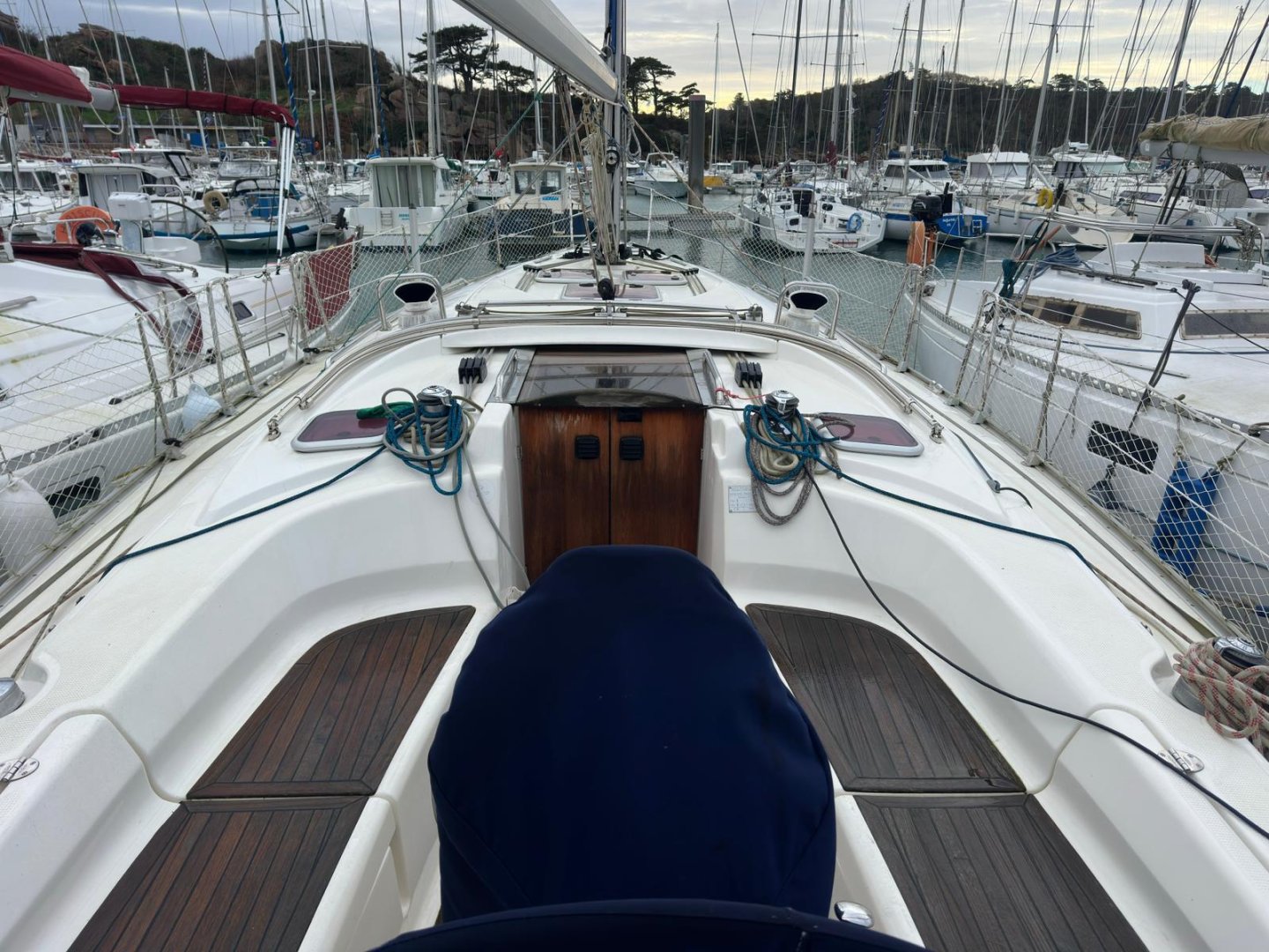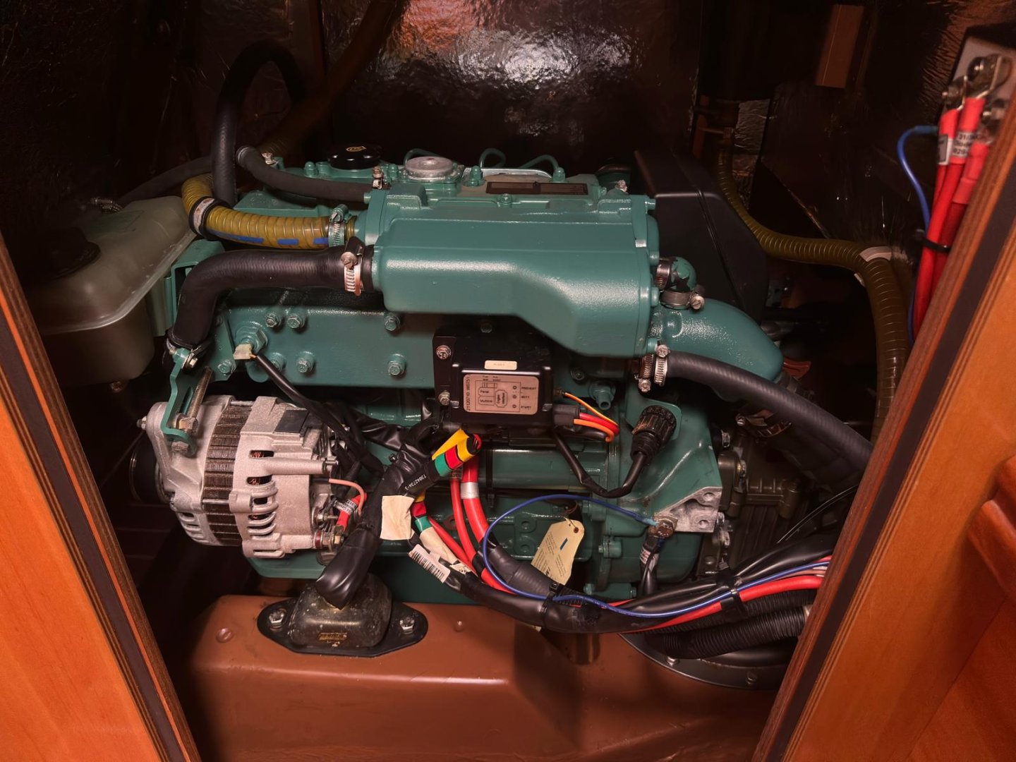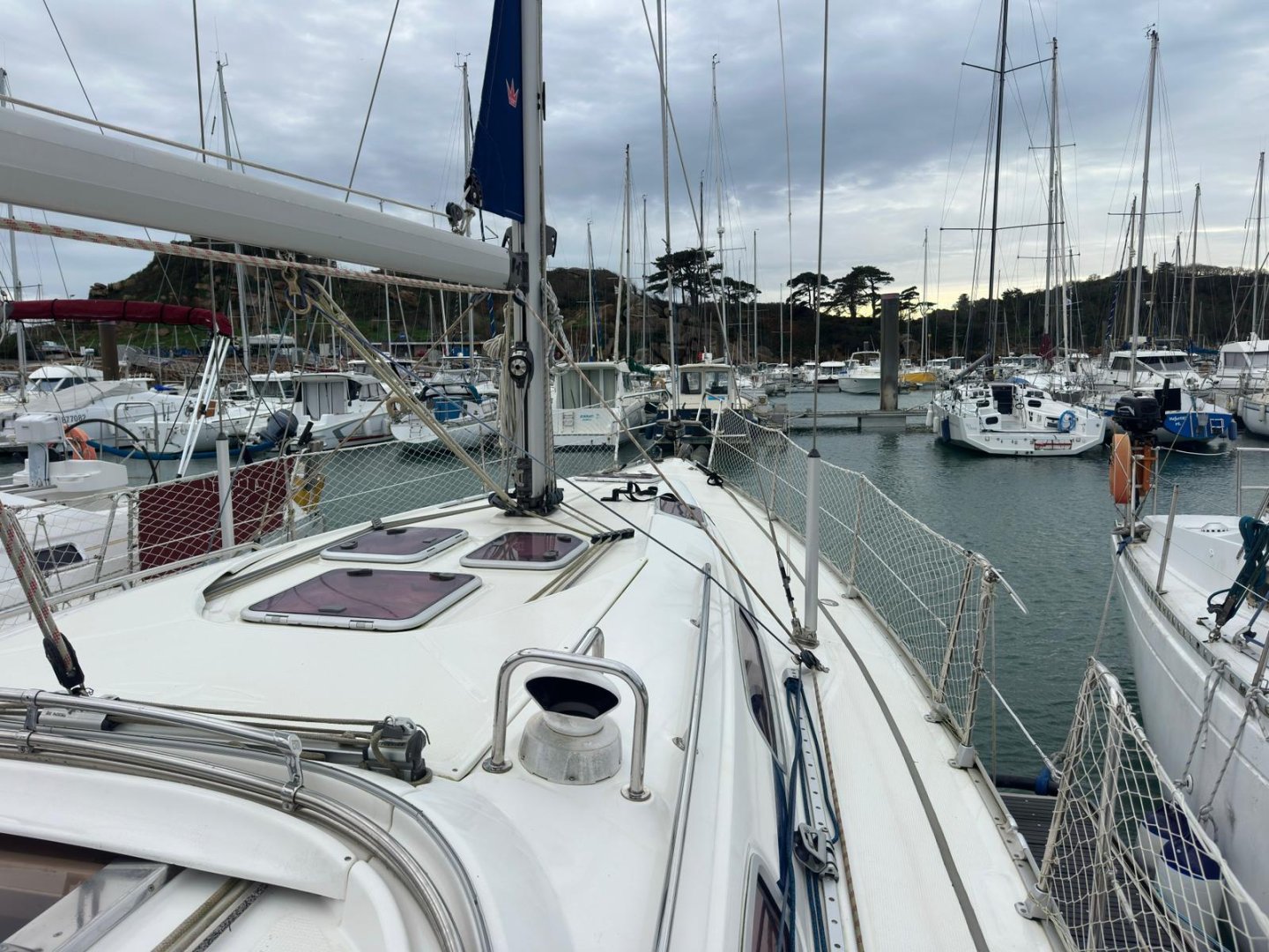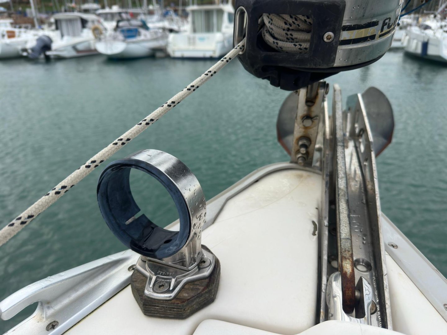 Moteur Volvo Penta D2-40 – 40 CV (1 600 h), entretien suivi. Gréement récent, grand-voile sur enrouleur, génois et Code 0 pour une navigation polyvalente et performante.