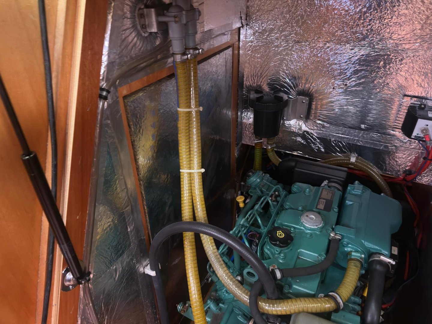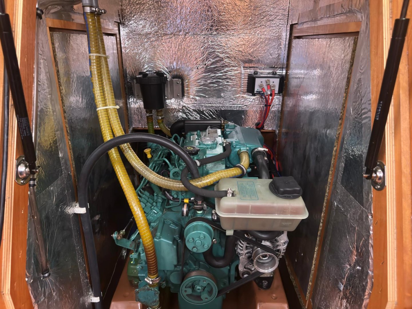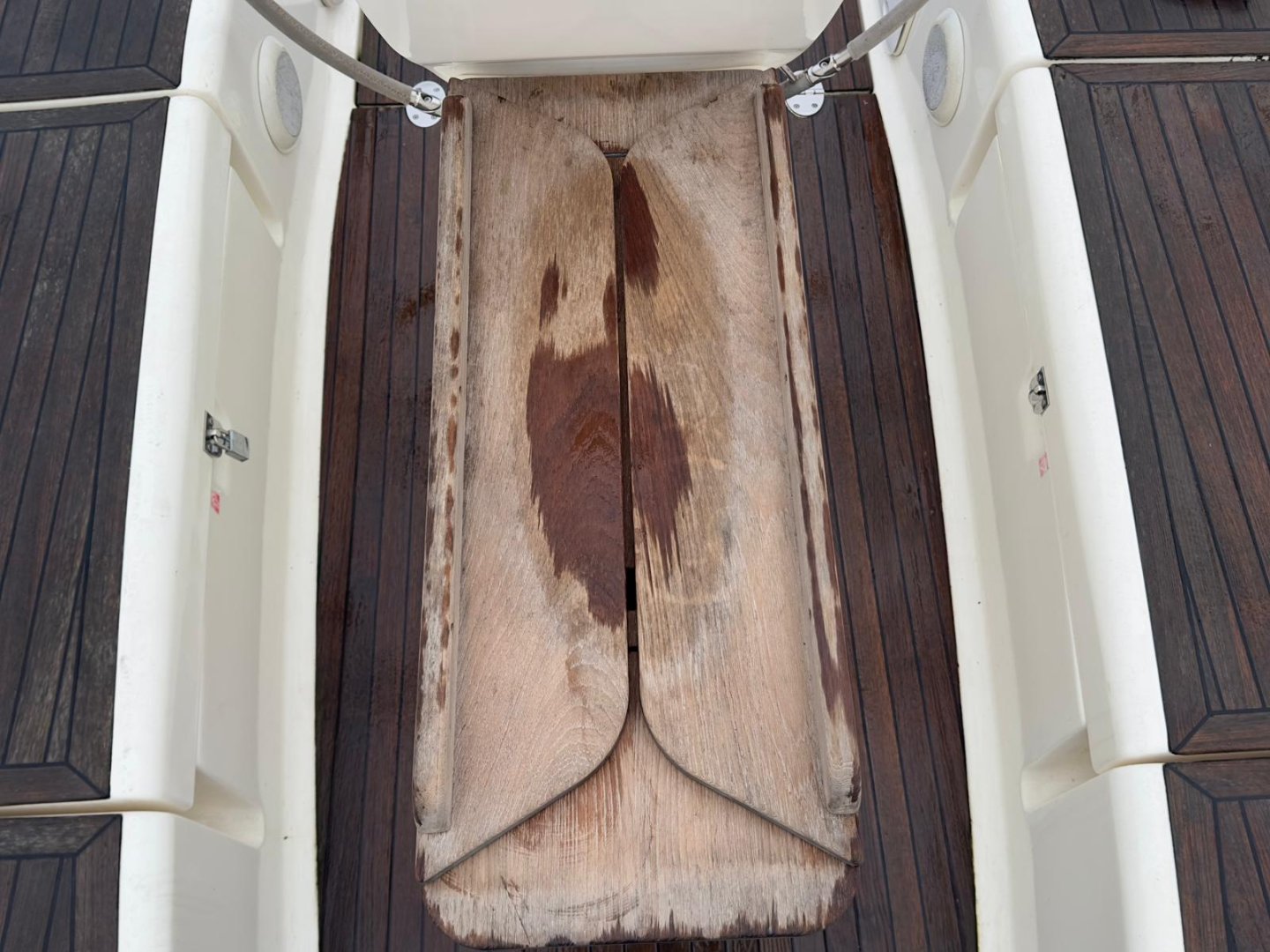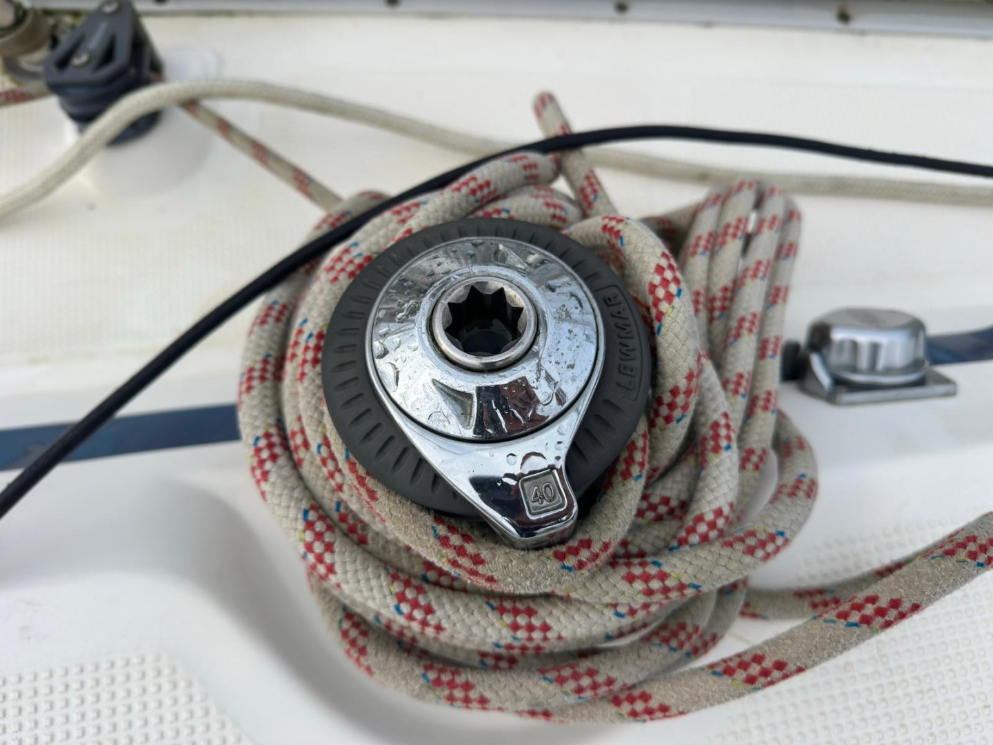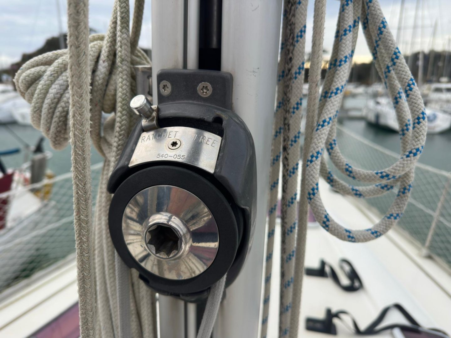 Moteur Volvo Penta D2-40 – 40 CV (1 600 h), entretien suivi. Gréement récent, grand-voile sur enrouleur, génois et Code 0 pour une navigation polyvalente et performante.