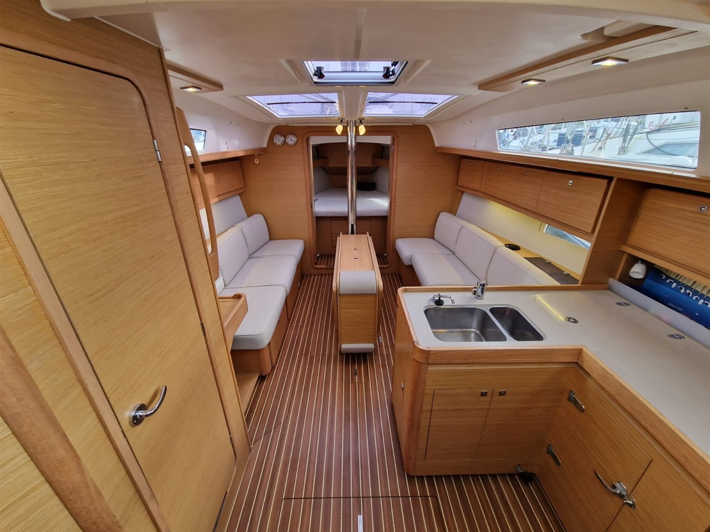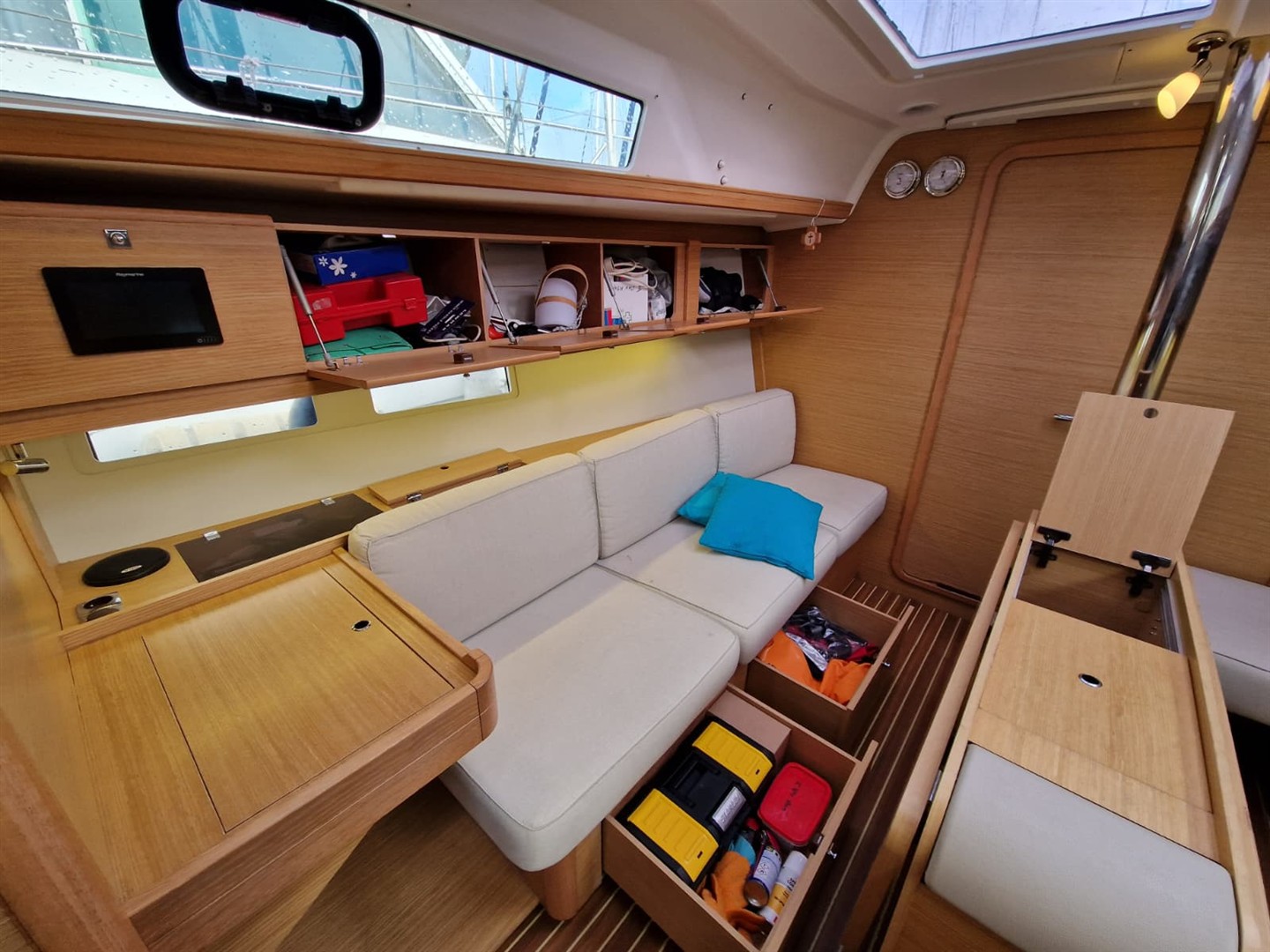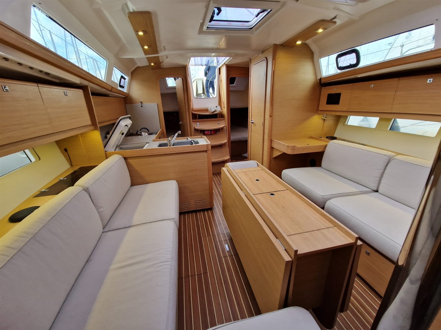 À l’intérieur, vous découvrirez un espace de vie lumineux et chaleureux, sublimé par de larges hublots et un aménagement moderne signé Dufour. Les volumes sont optimisés avec de nombreux rangements intelligemment intégrés, offrant un confort remarquable pour les séjours prolongés à bord.