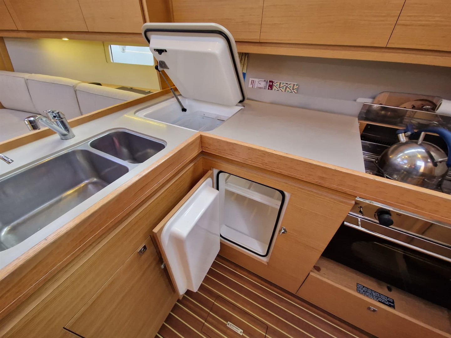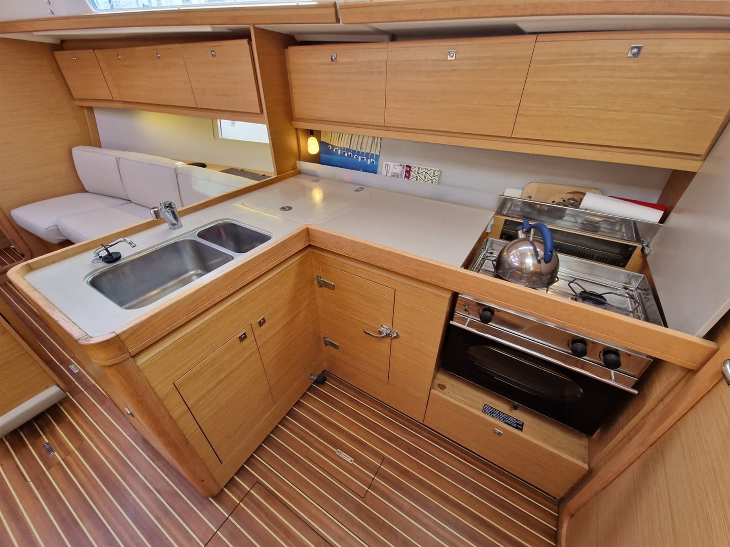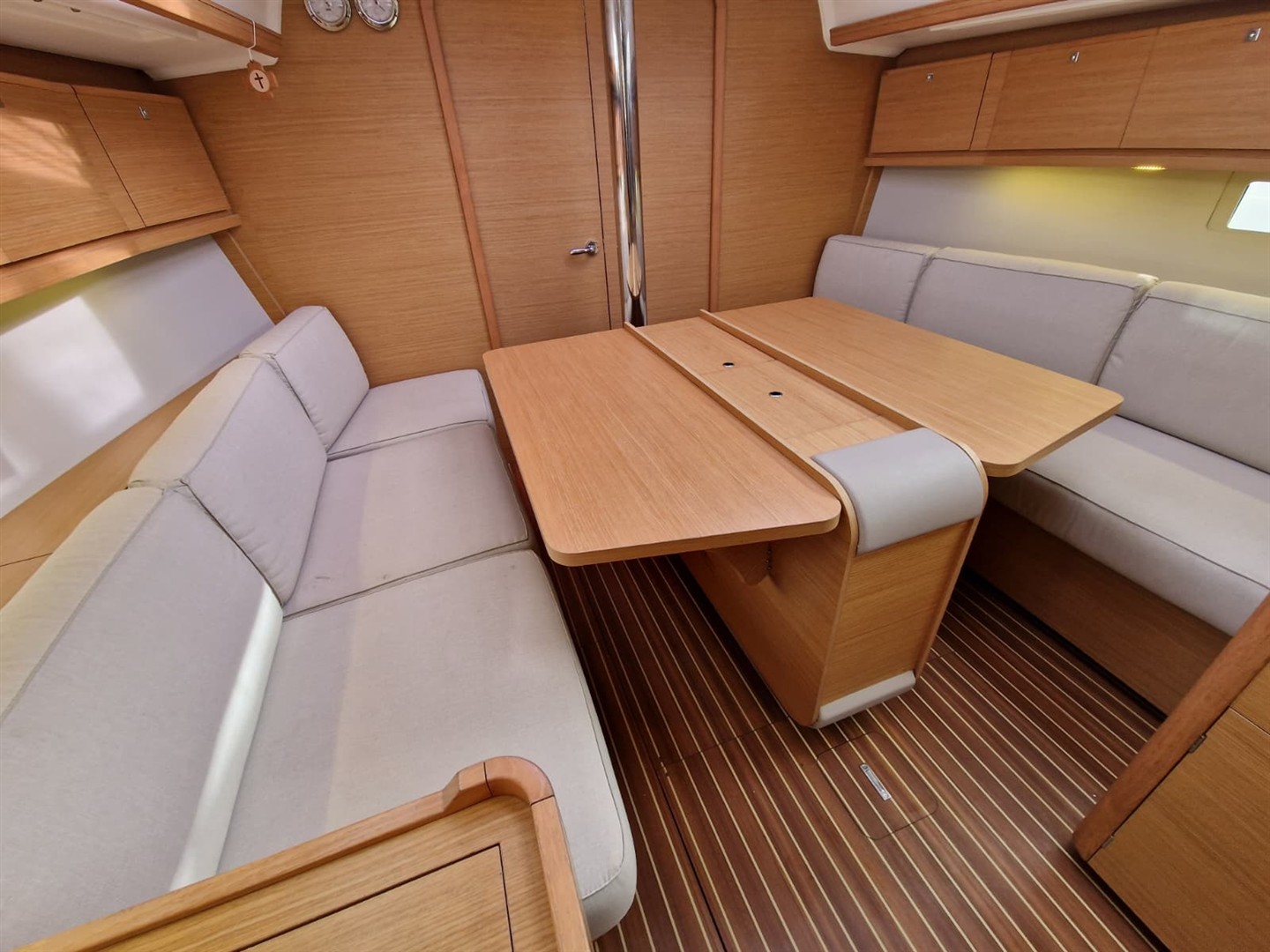 À l’intérieur, vous découvrirez un espace de vie lumineux et chaleureux, sublimé par de larges hublots et un aménagement moderne signé Dufour. Les volumes sont optimisés avec de nombreux rangements intelligemment intégrés, offrant un confort remarquable pour les séjours prolongés à bord.
